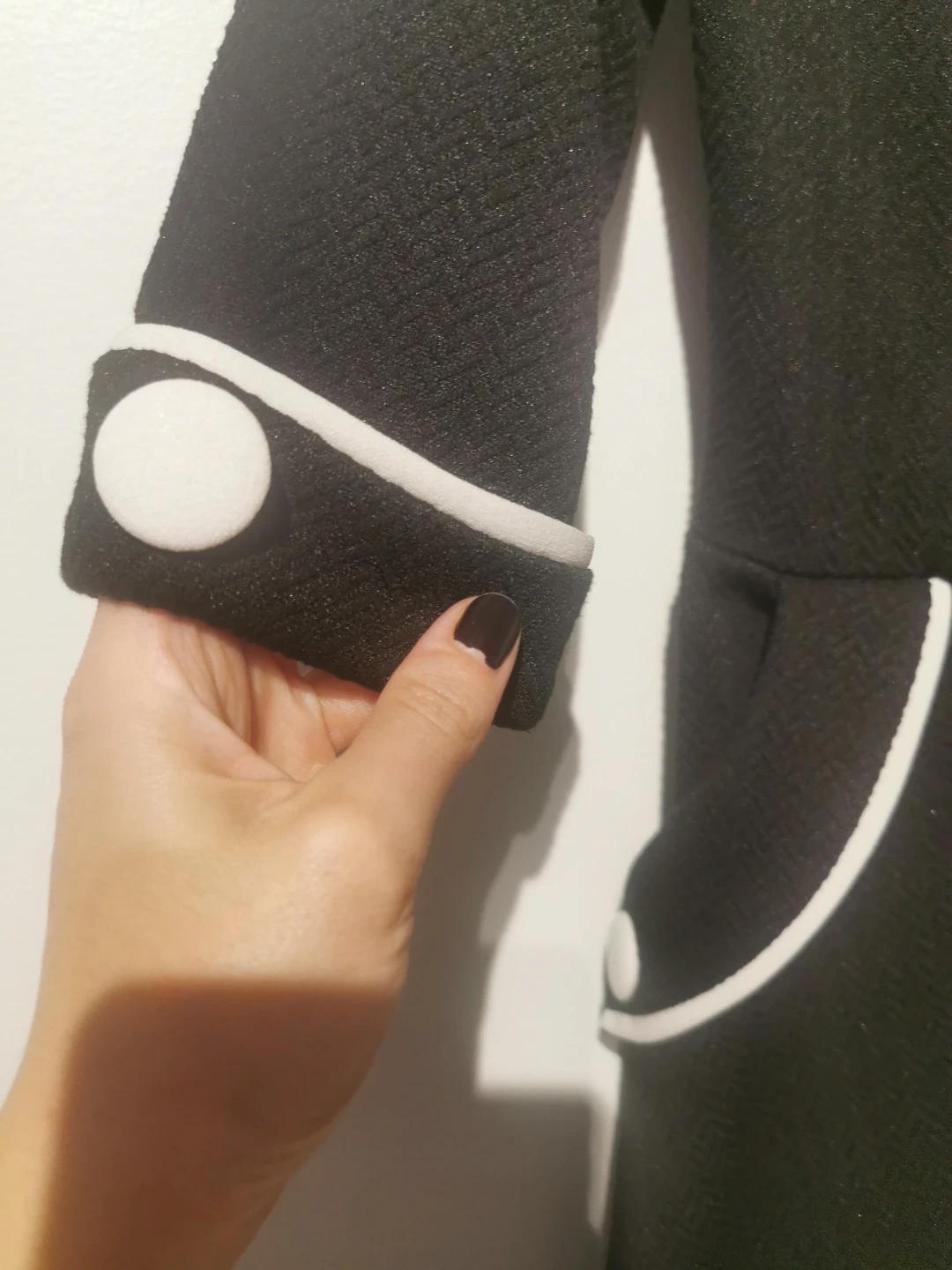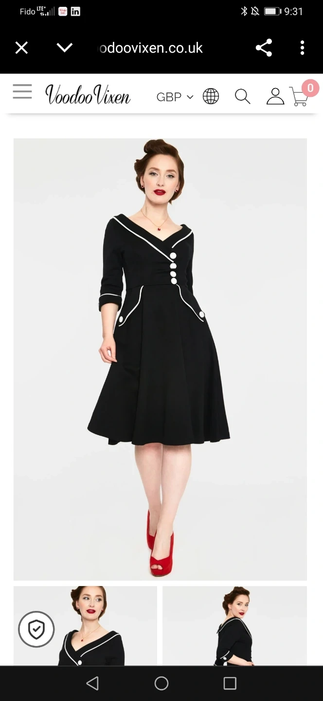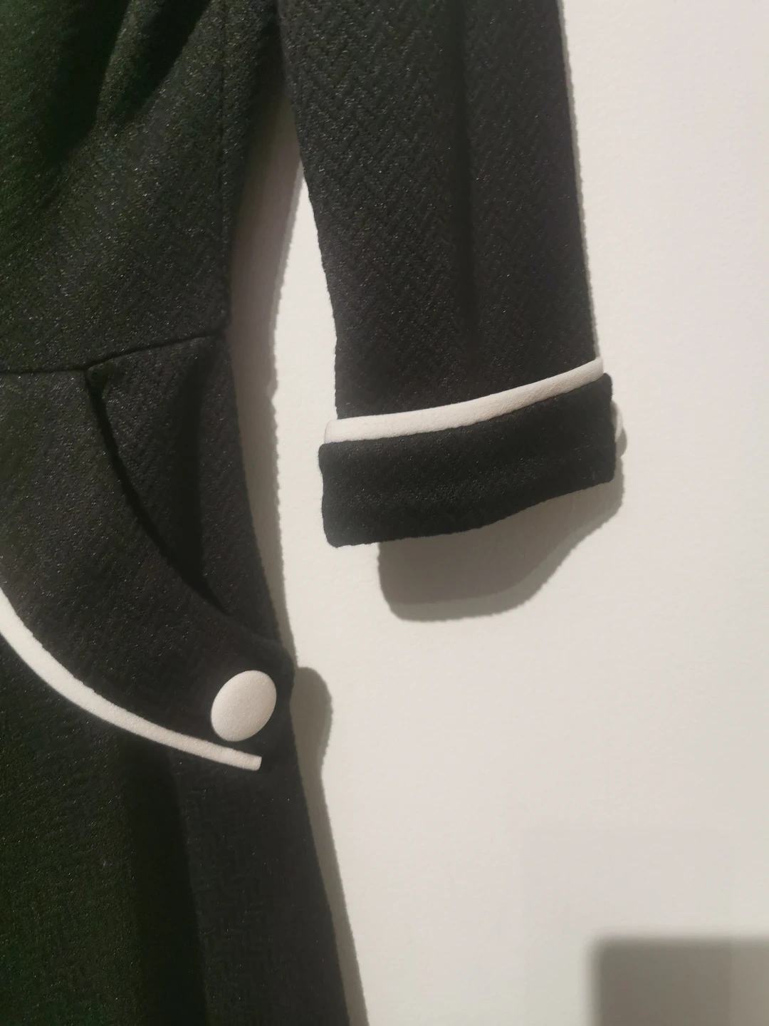 Black dress with white trim detailing. Features buttons and a flared skirt. Offers a sleek, vintage aesthetic. This dress is perfect for a relaxing day out.