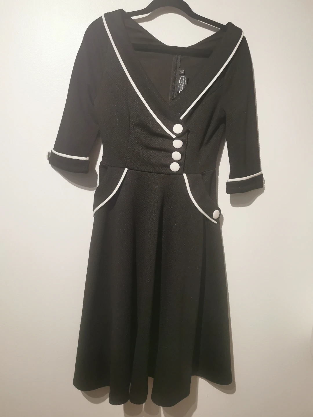 Black dress with white trim detailing. Features buttons and a flared skirt. Offers a sleek, vintage aesthetic. This dress is perfect for a relaxing day out.