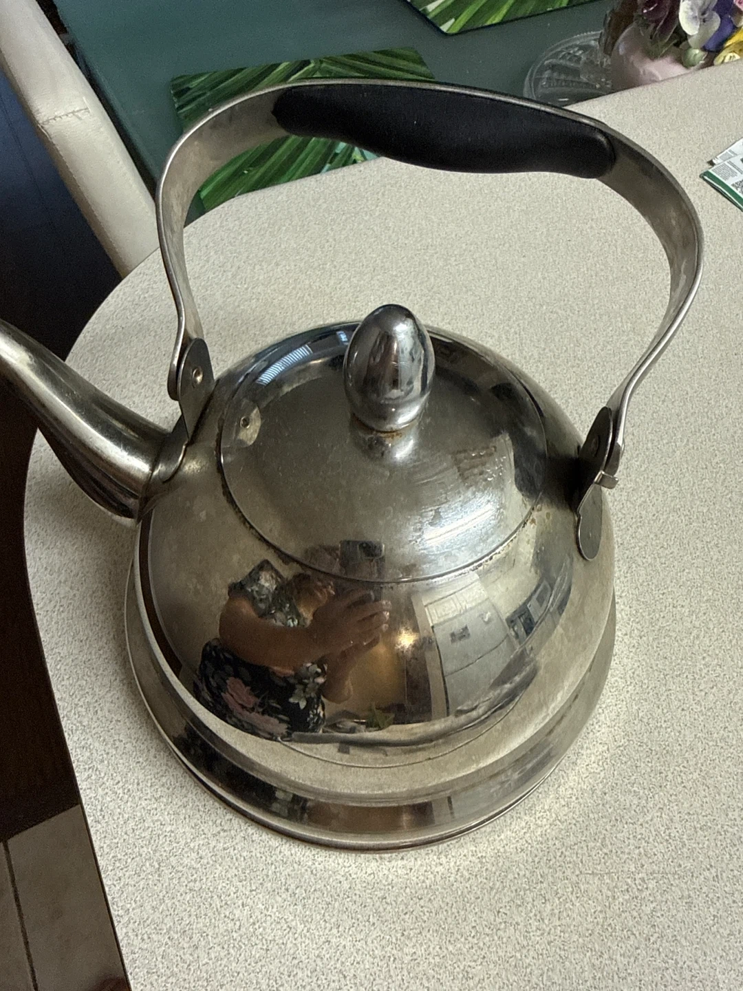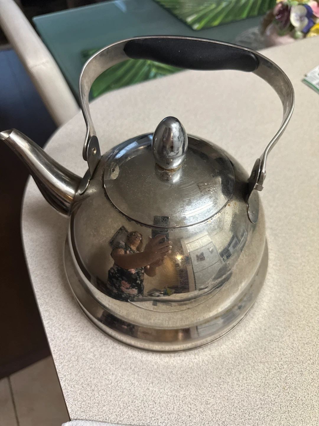This is a classic stainless steel tea kettle. It's made of durable metal and features a comfortable handle for pouring. It's perfect for quickly boiling water on the stovetop for your favourite hot beverages!