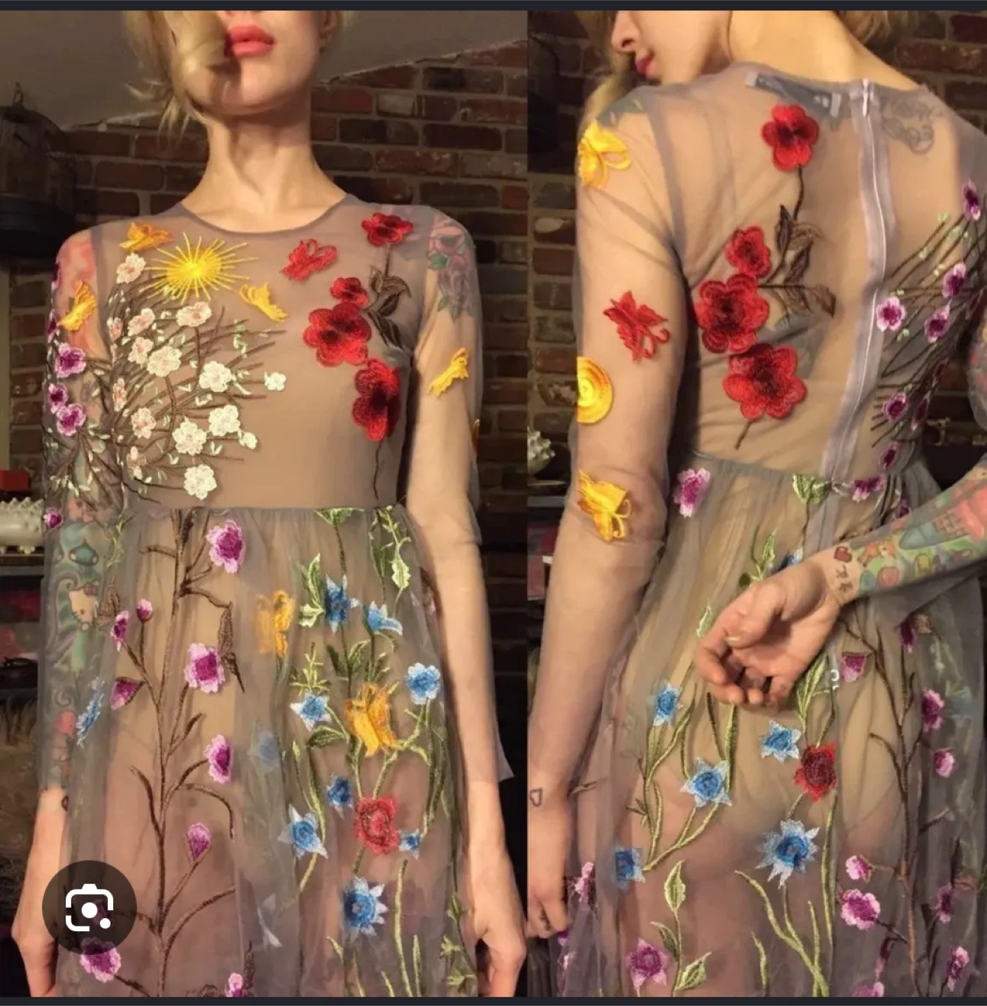 Sheer maxi dress with intricate floral embroidery all over. It features long sleeves and a round neckline. Zipper closure at the back. Perfect for special occasions! Size small.