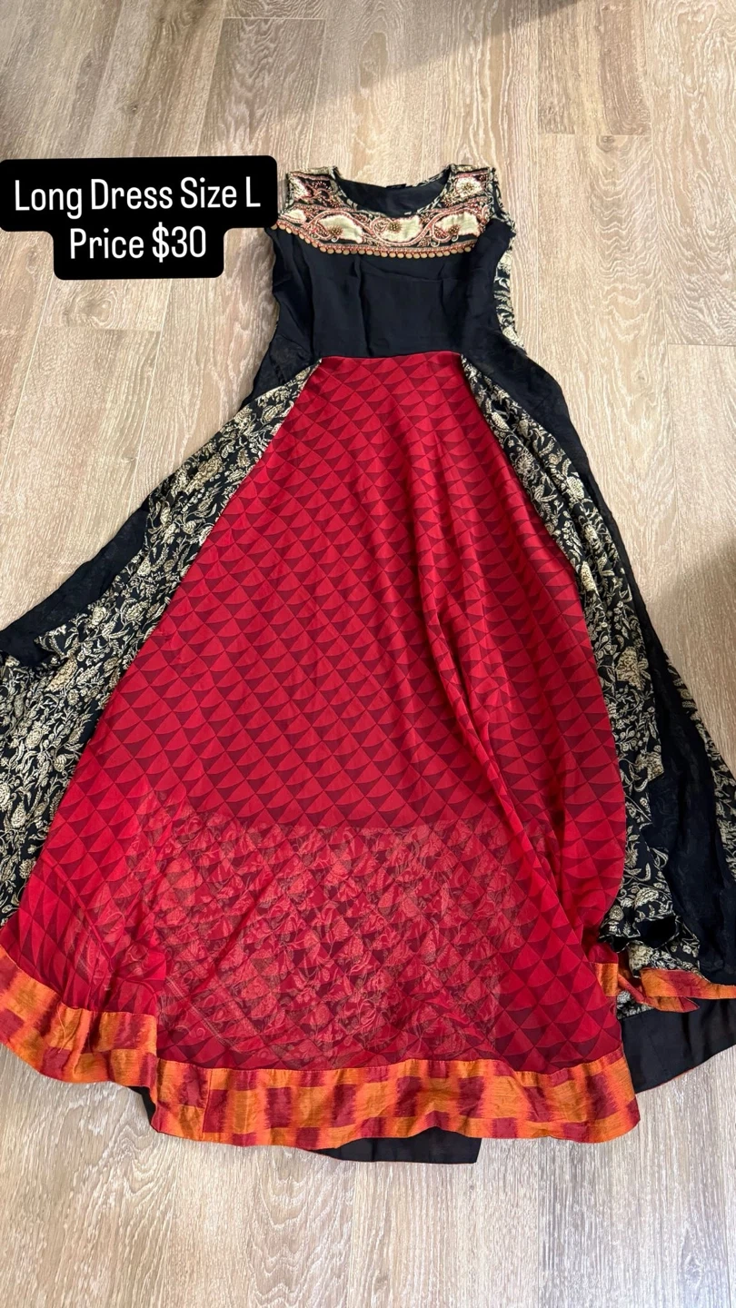 Long dress in size L. It features a black top, a red patterned skirt, and floral patterns on the sides. Originally listed for $30