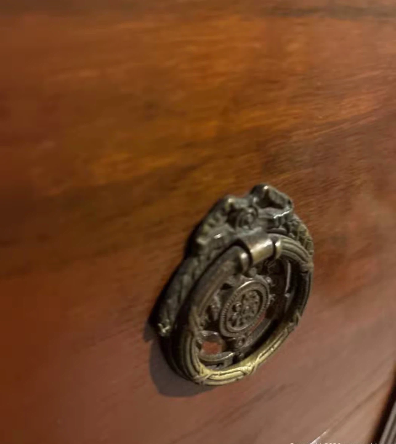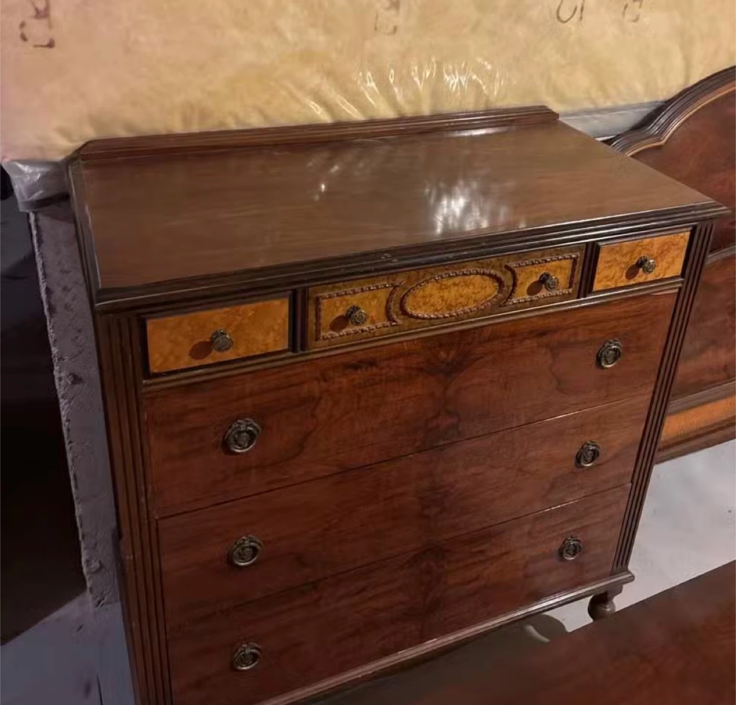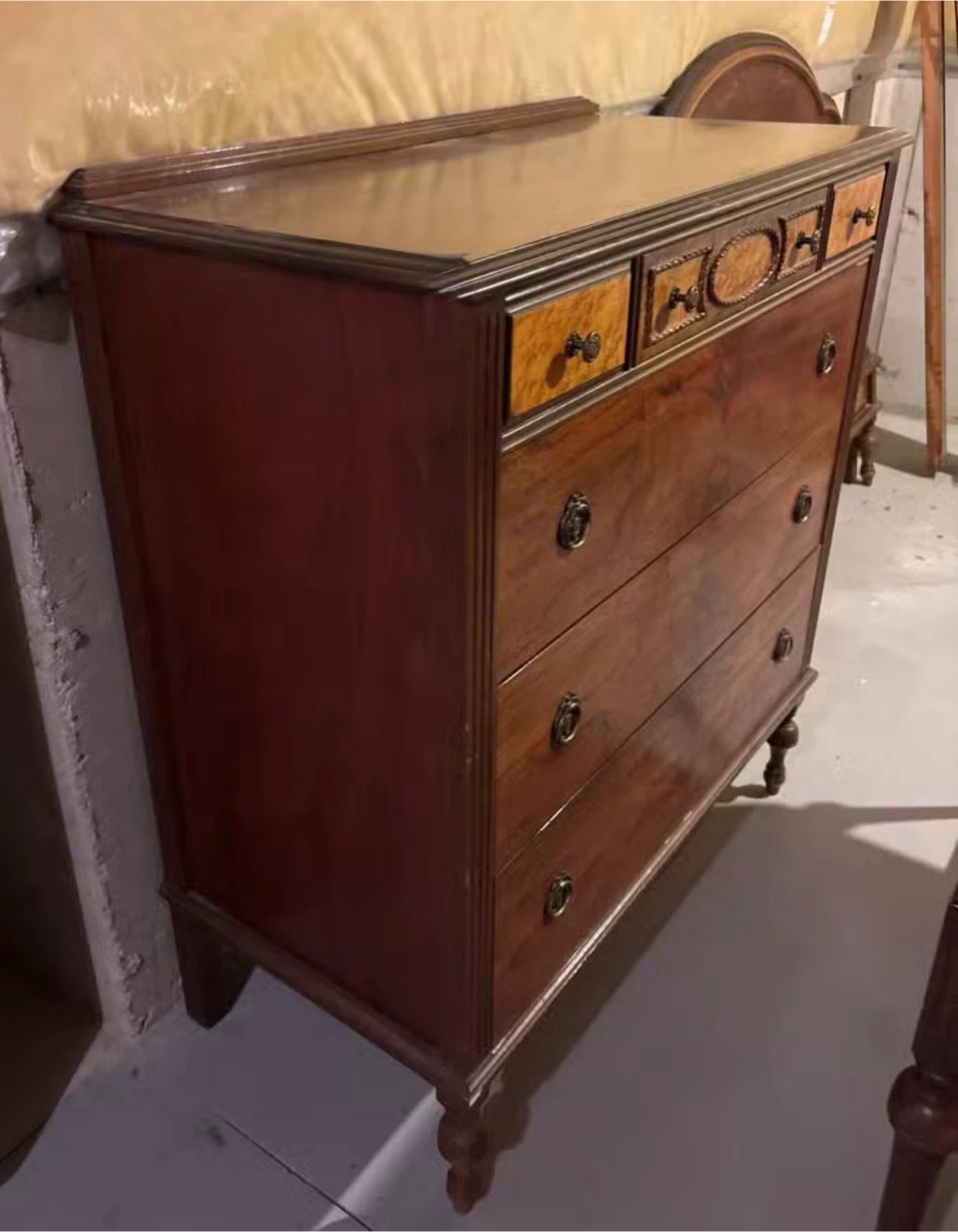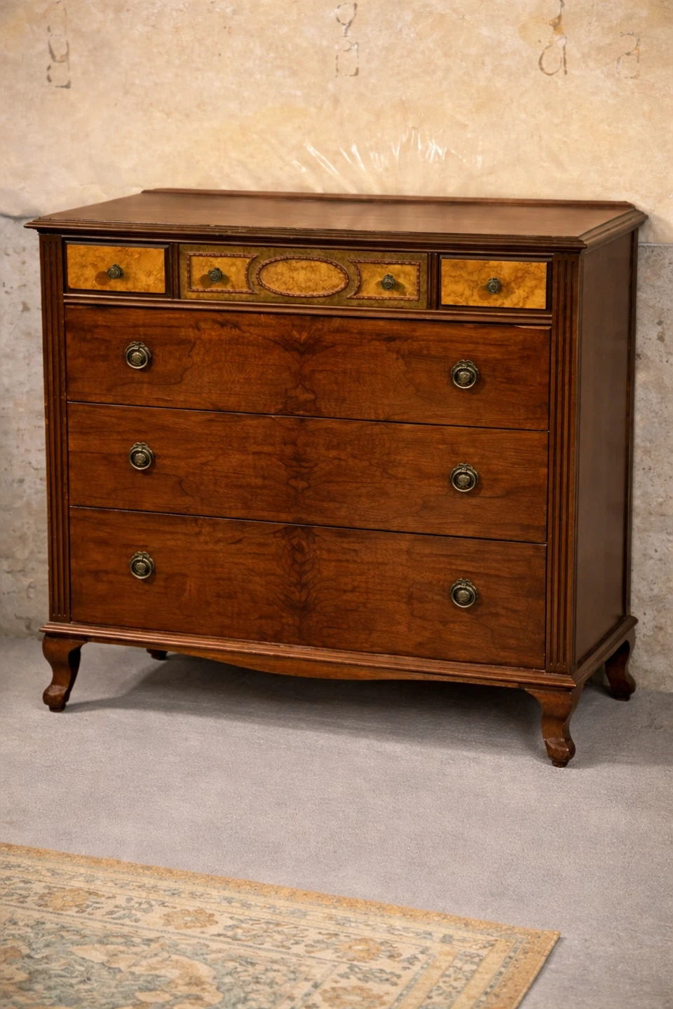 A classic wooden dresser with ornate brass hardware. Features four spacious drawers for storage and a decorative top section with smaller drawers. Wood grain is rich and visible throughout.