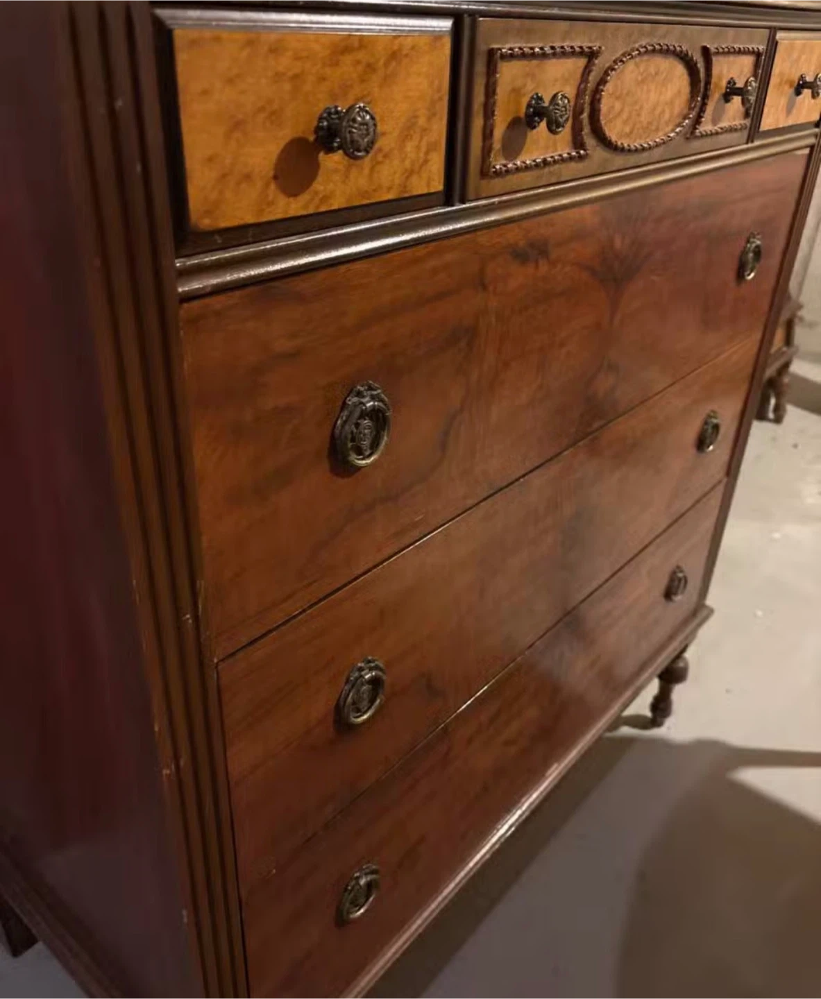 A classic wooden dresser with ornate brass hardware. Features four spacious drawers for storage and a decorative top section with smaller drawers. Wood grain is rich and visible throughout.