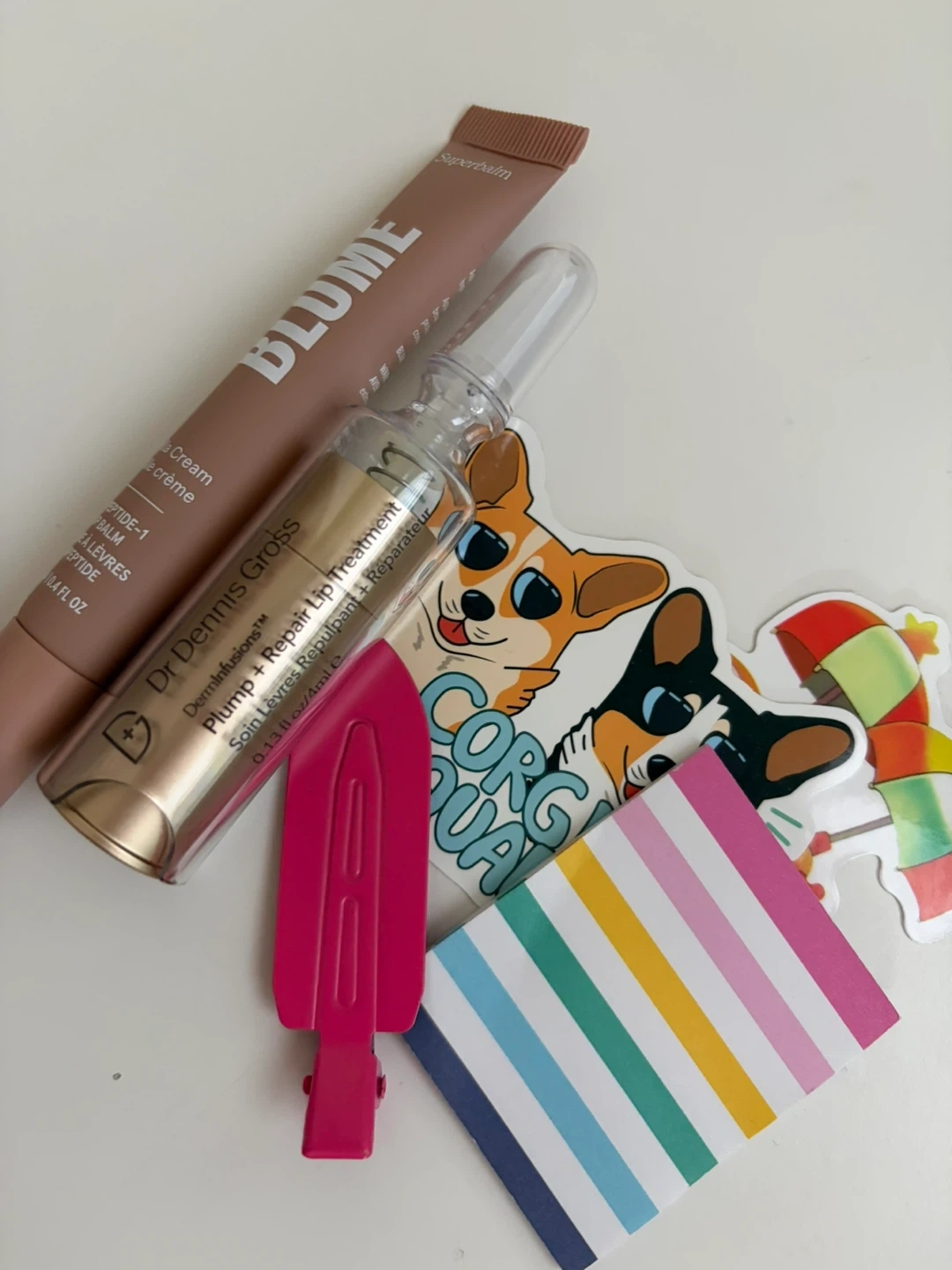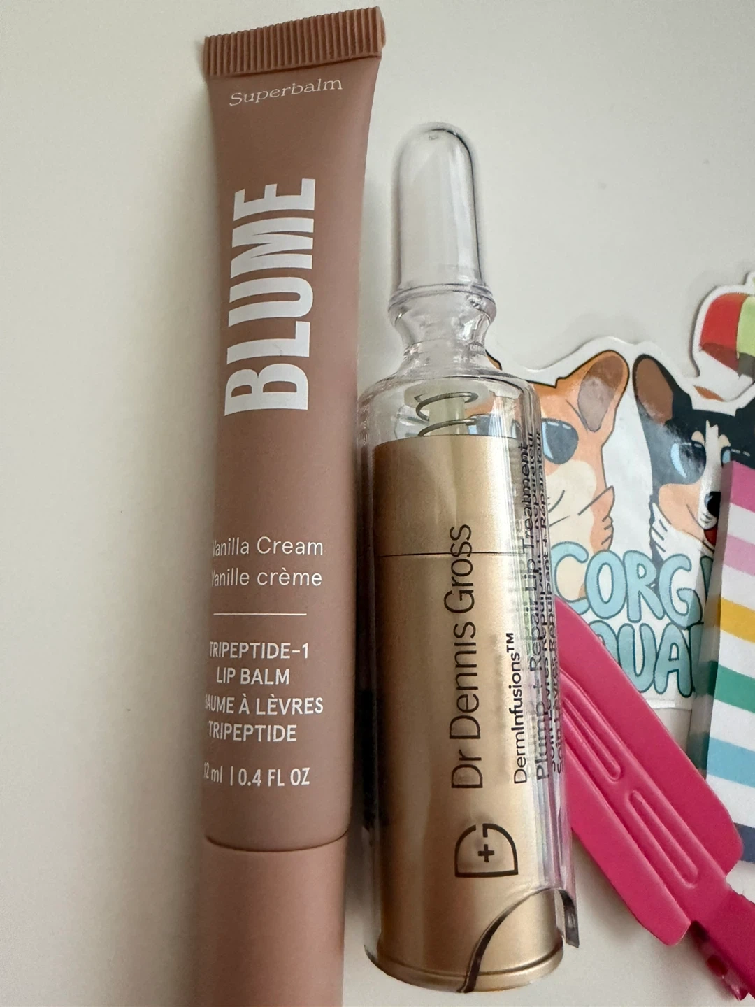 This set is Dr. Dennis Gross Plump + Lip Treatment and Blume Vanilla Lip Balm.