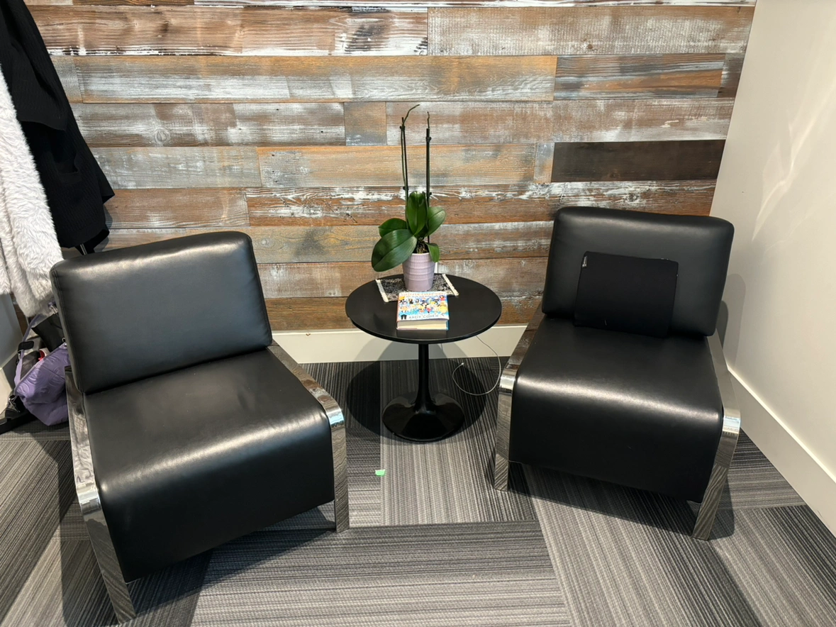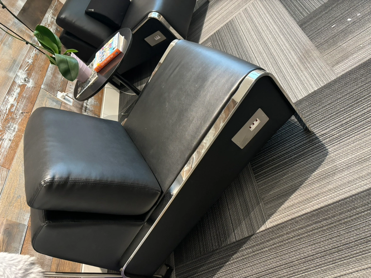Media loungers. Have power cord to connect usb and phone chargers directly to chairs.