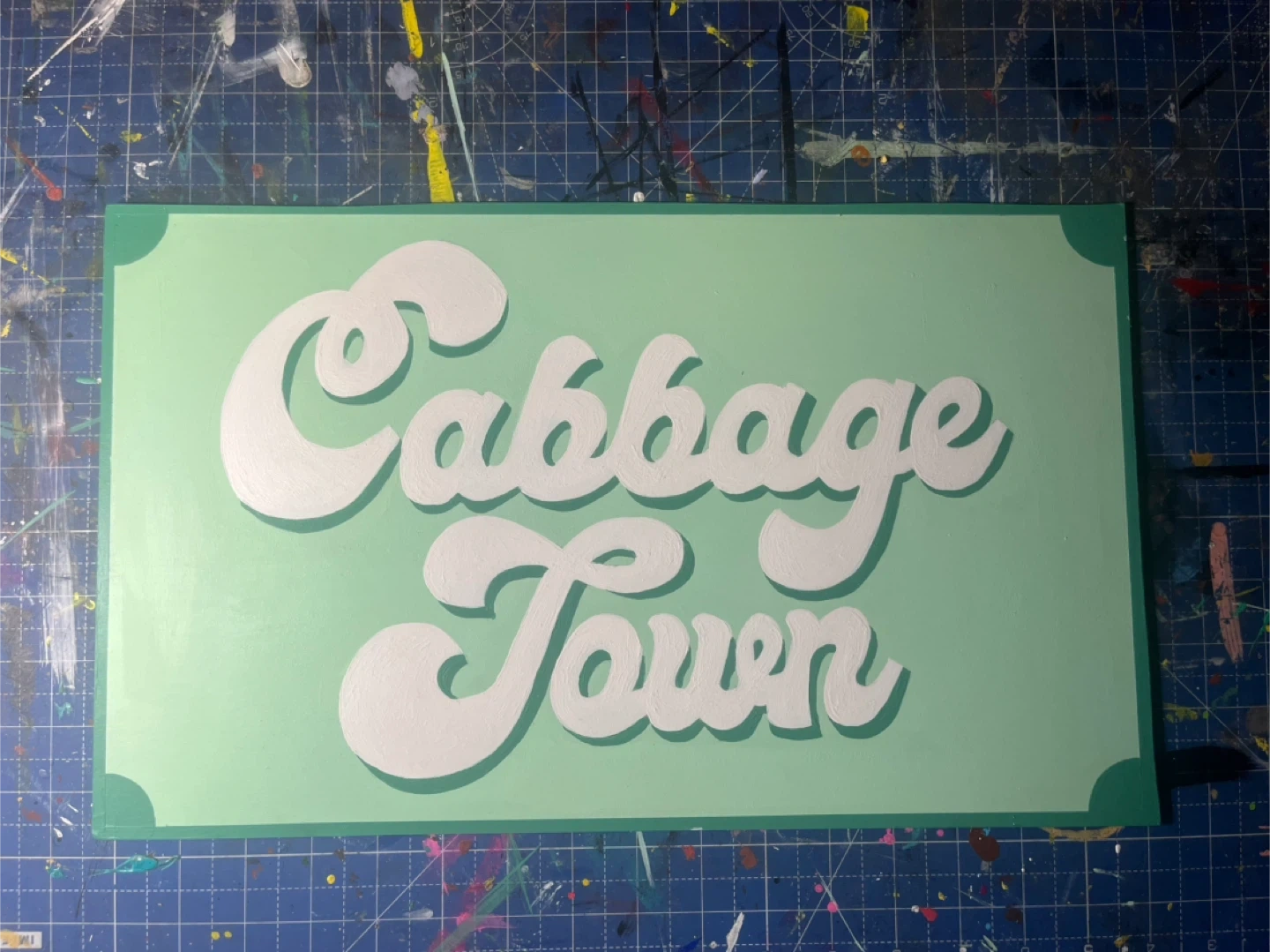 This is a handmade sign that says 'Cabbage Town'. The lettering is white with a shadow effect against a mint green background. It's a fun decorative piece. This sign would look neat on a wall or door! Painted on mdf.