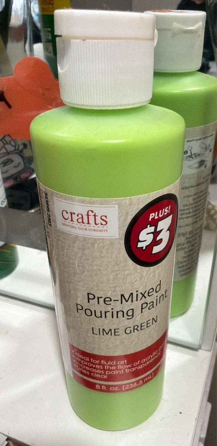 Pre-mixed pouring paint in Lime Green. Ideal for fluid art, it improves acrylic paint flow and transparency. Dries clear. 8 fl. oz. (236.5 mL) bottle.