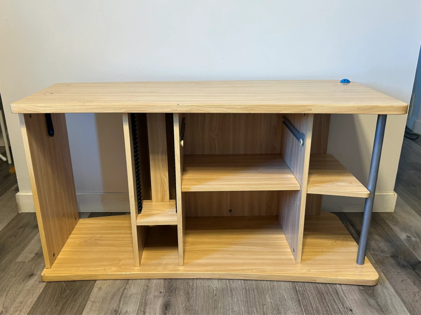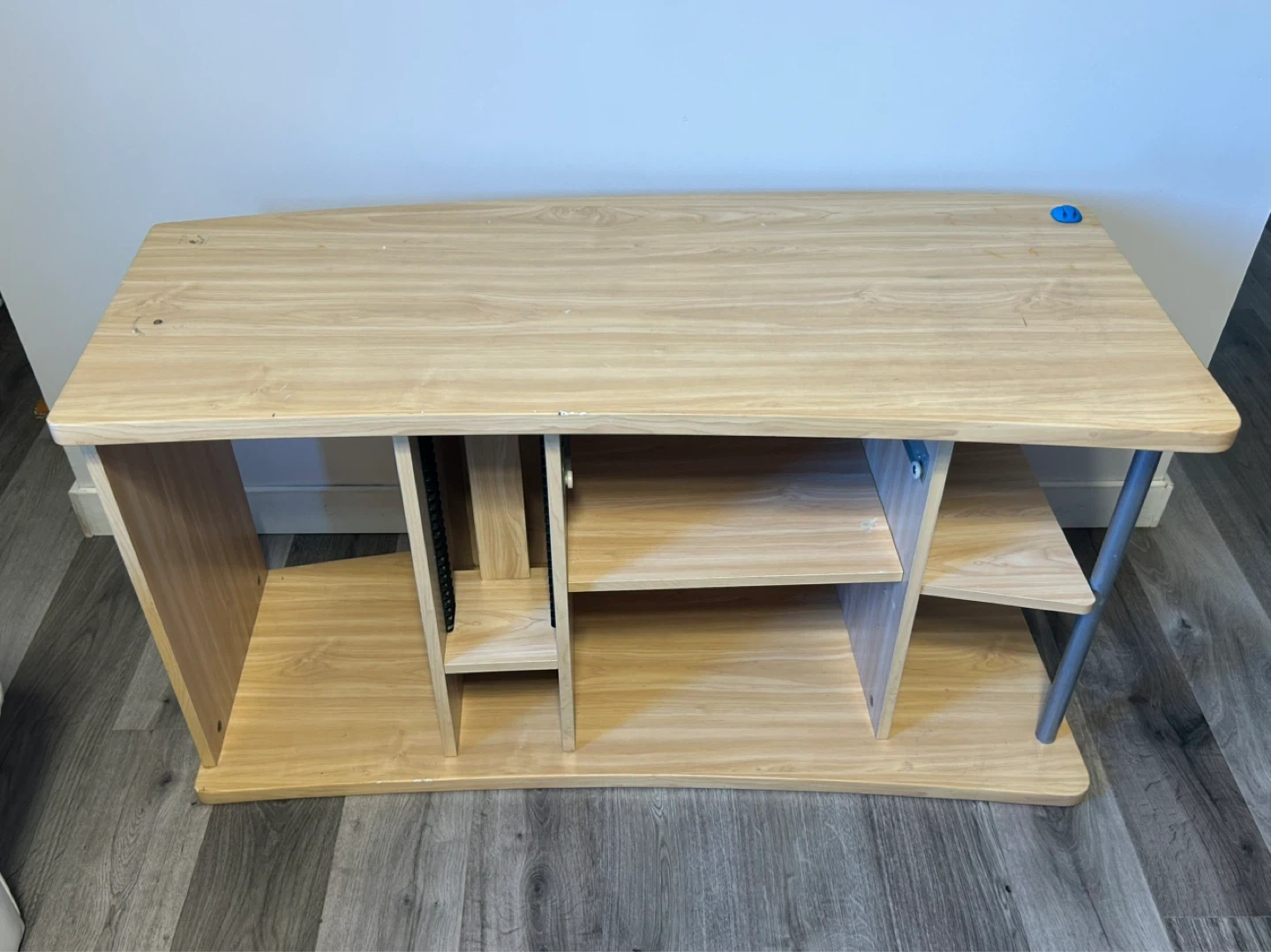 This is a light wood entertainment unit with multiple shelves for storage. It's got a curved front and metal legs. Perfect for organizing your media devices and accessories!