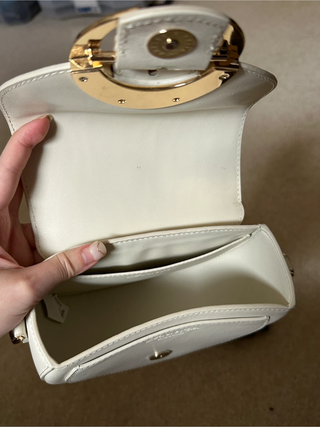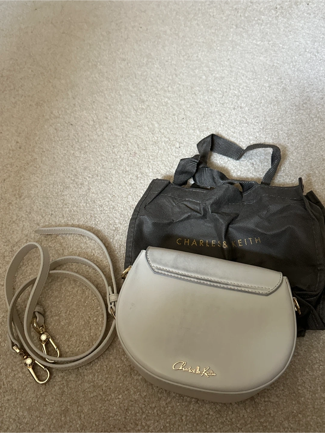 Cream coloured shoulder bag from Charles and Keith. Includes dust bag and adjustable strap. It has a main compartment and a smaller internal pocket.