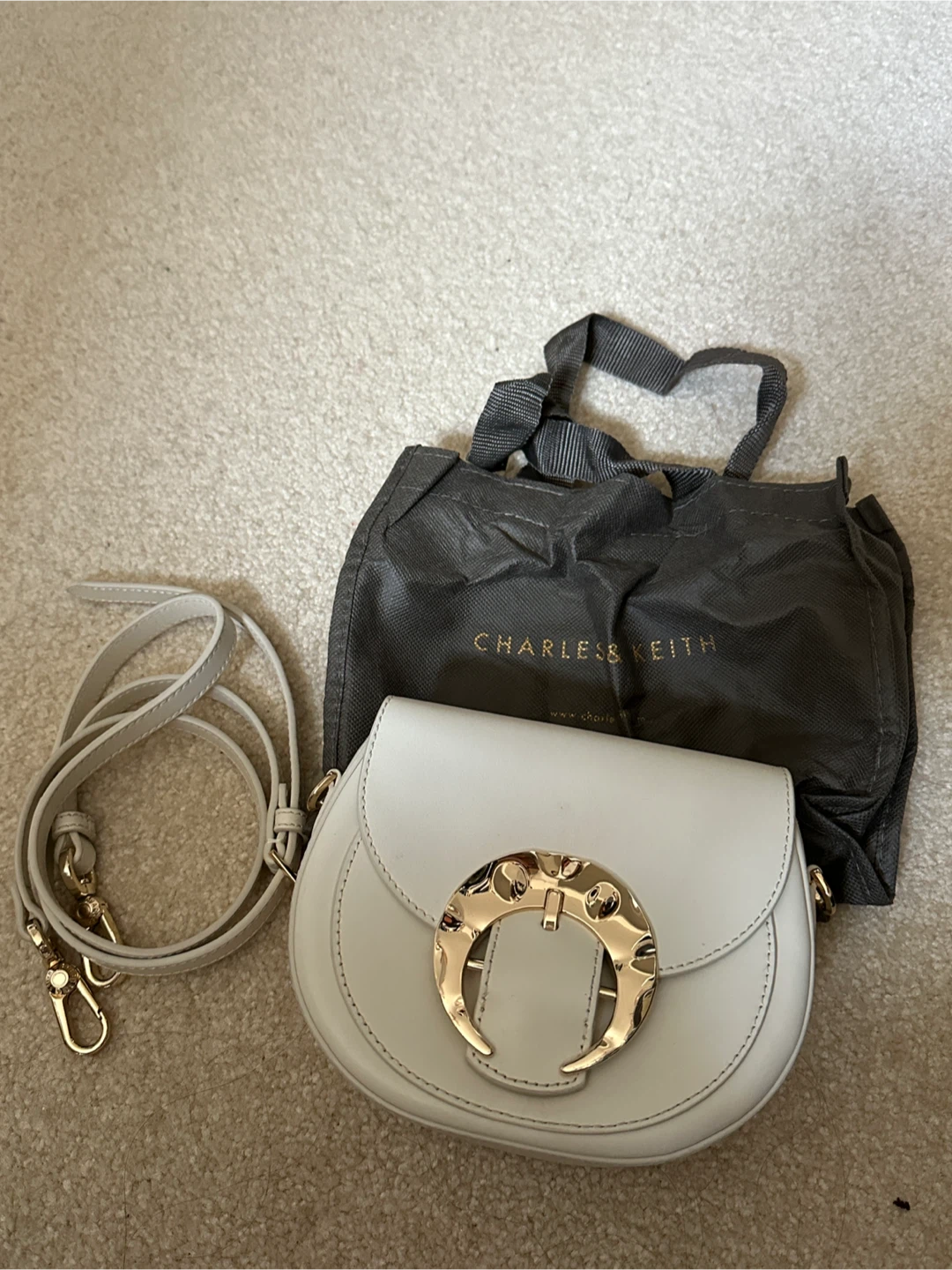 Cream coloured shoulder bag from Charles and Keith. Includes dust bag and adjustable strap. It has a main compartment and a smaller internal pocket.