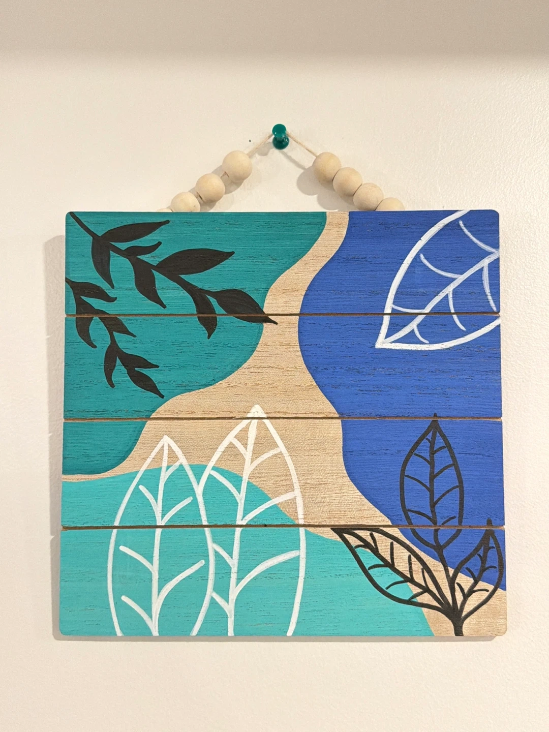 Hand-painted wooden wall art featuring a modern abstract leaf design. (8 inch x 8 inch)