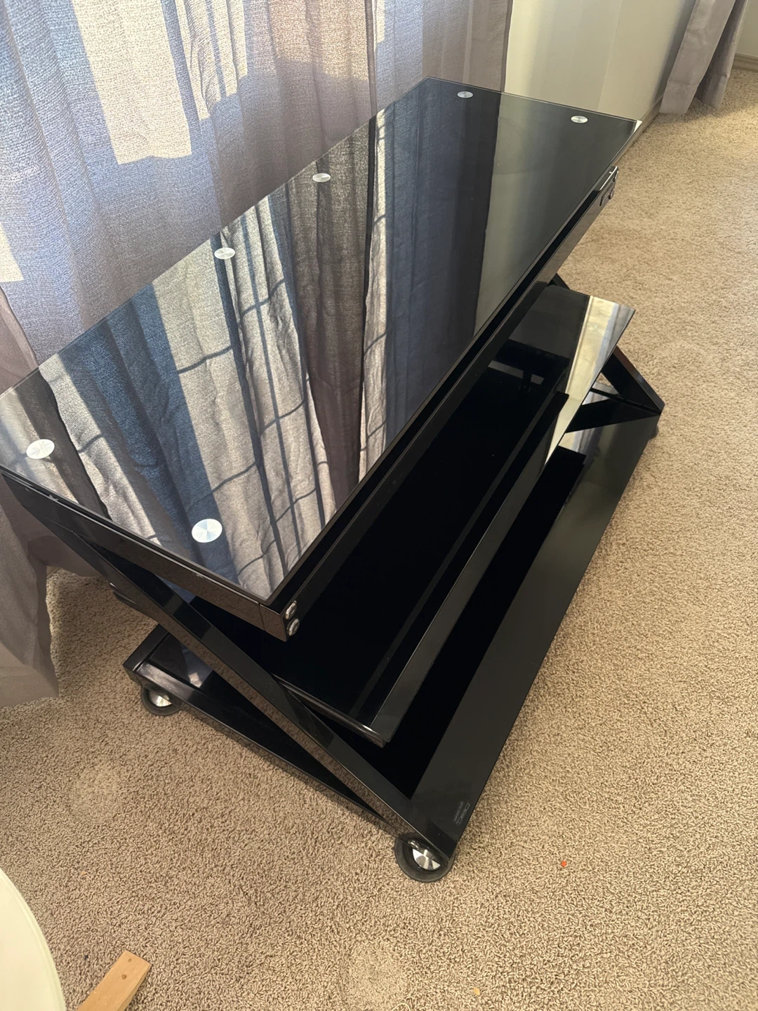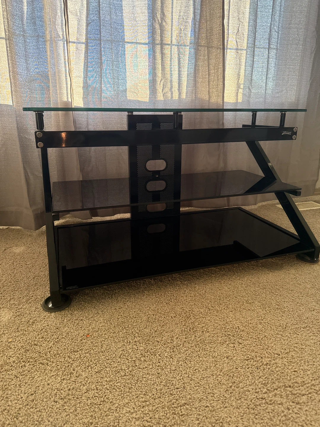 This is a sleek black glass entertainment stand. It features multiple shelves for your media components and has wheels for easy movement. The tempered glass provides a sturdy surface.