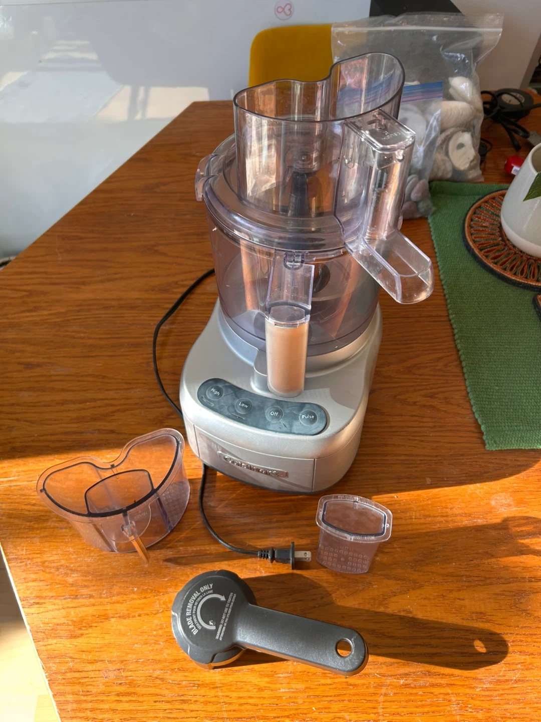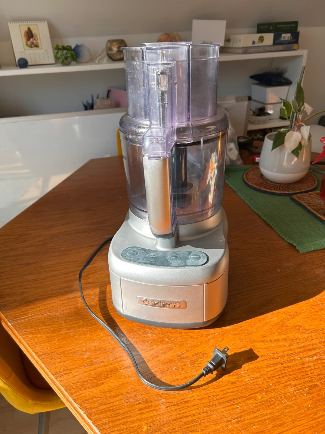 This Cuisinart food processor comes with a chopping blade and extra accessories. It's silver and has multiple function buttons on the base. This baby’s a workhorse. It’s one of those heirloom machines that never quits.
