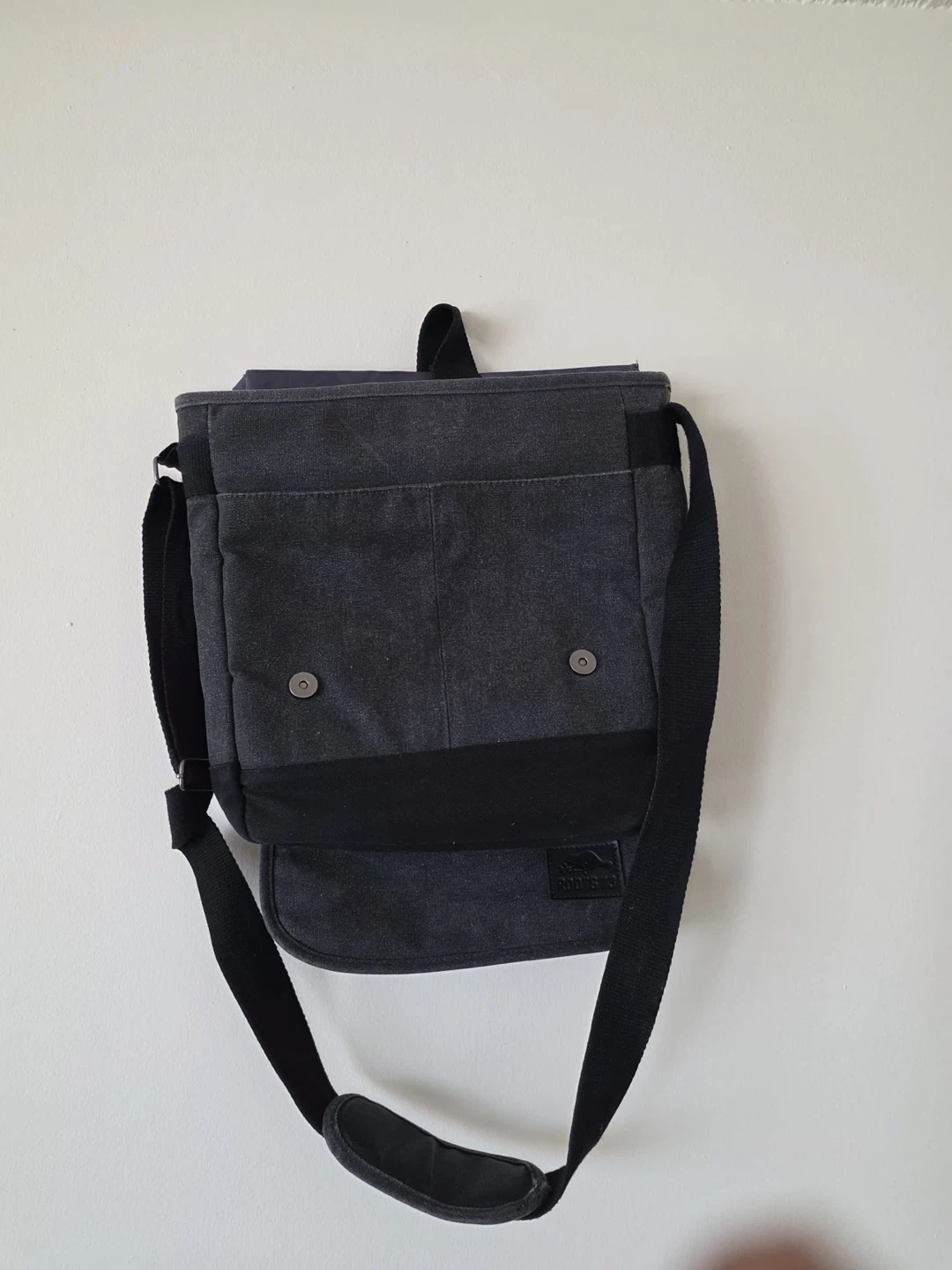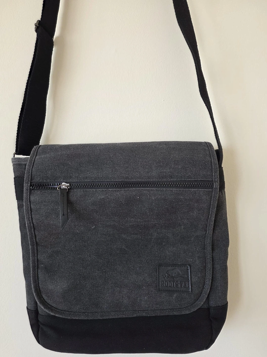 Dark grey canvas messenger bag by Roots 73. It has a zippered front pocket and an adjustable shoulder strap. This bag is great for carrying everyday essentials.
