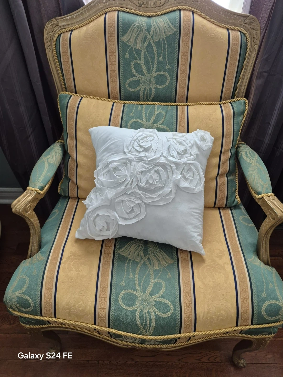 Two matching green and yellow Bombay Chairs available. Only used in sitting room as decorative pieces.