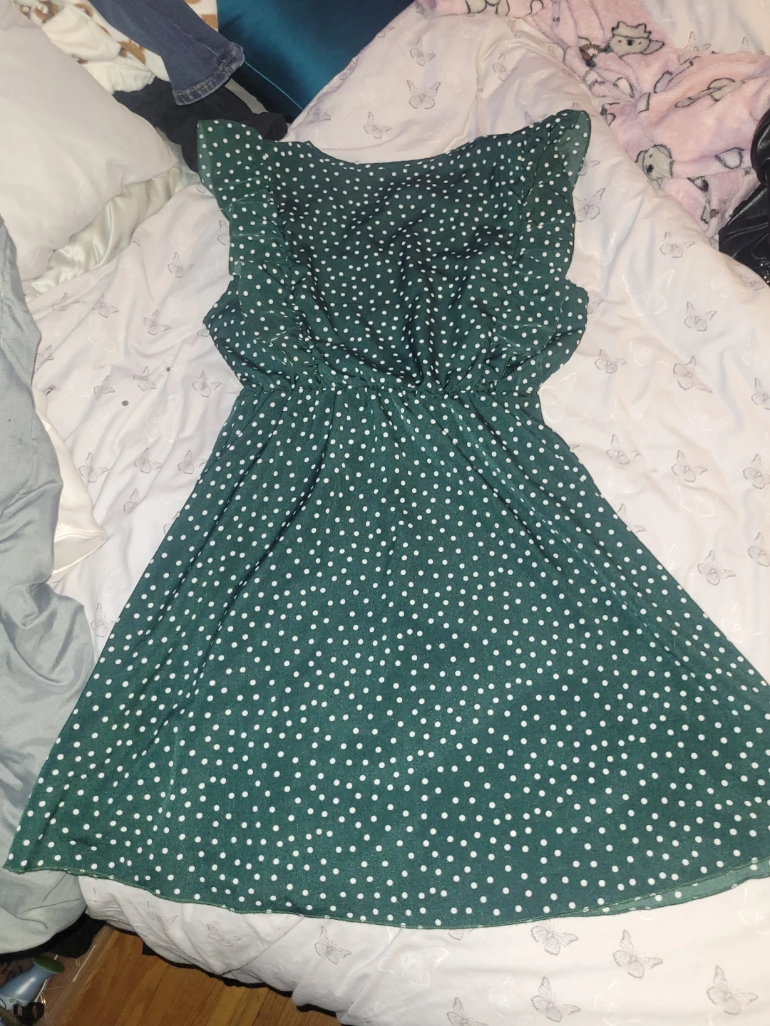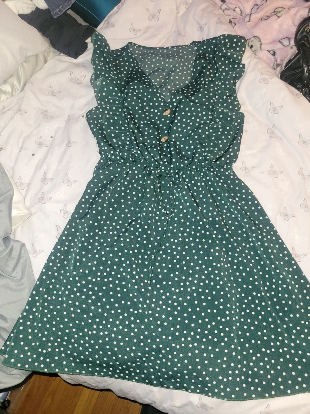 This SHEIN dress is a deep green with a white polka dot pattern. It features a V-neck, button-front detail, and ruffle sleeves. The waist is cinched with a drawstring for a flattering fit. Size is medium.