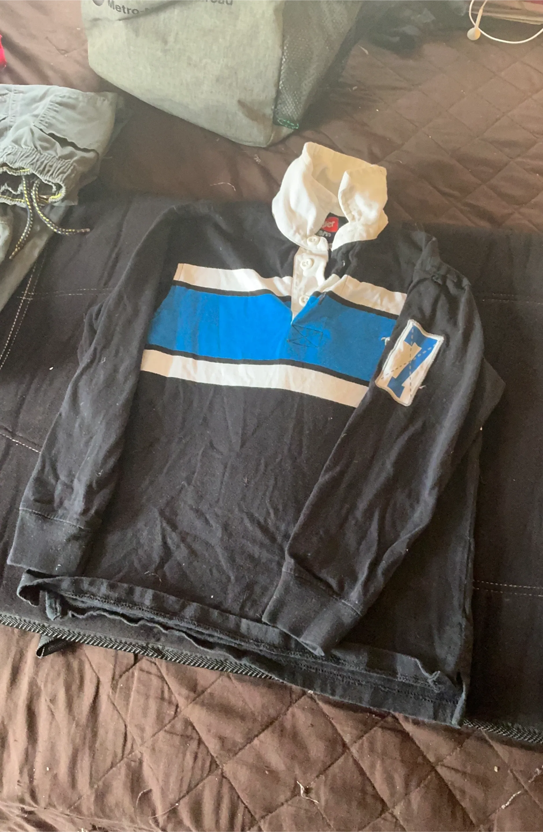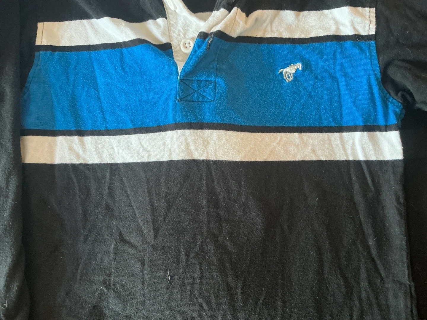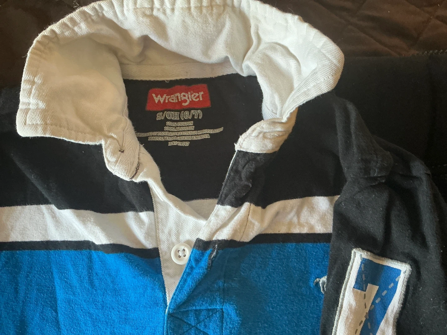 Wrangler long-sleeve rugby shirt. 100% cotton material. Features a white collar and blue and white stripes across the chest. It has a patch with the number 7 on the left sleeve.