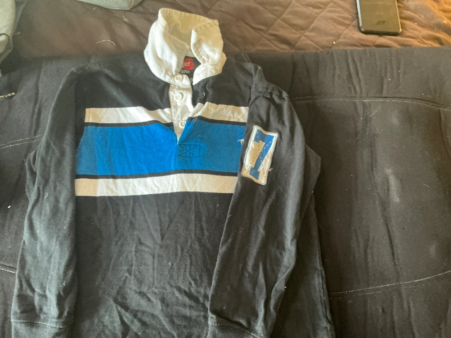 Wrangler long-sleeve rugby shirt. 100% cotton material. Features a white collar and blue and white stripes across the chest. It has a patch with the number 7 on the left sleeve.
