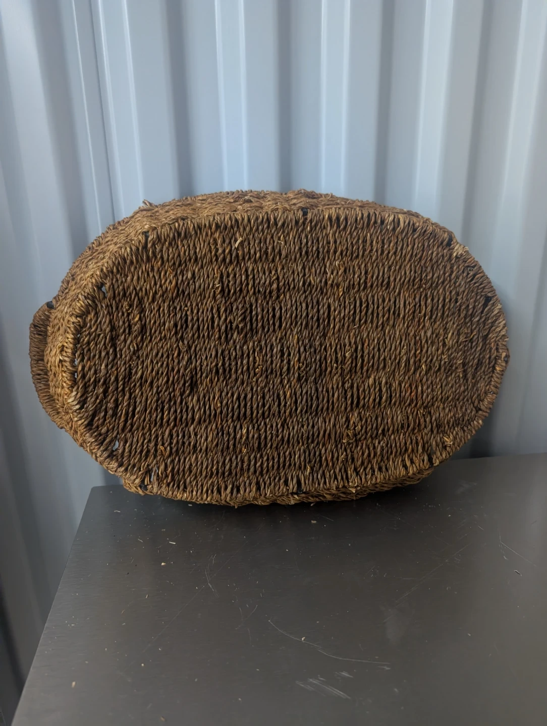 This oval basket is woven from natural seagrass. It features two sturdy handles for easy carrying. Its rustic design makes it a versatile piece for storage or display.