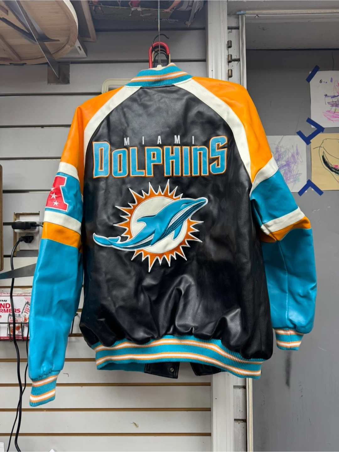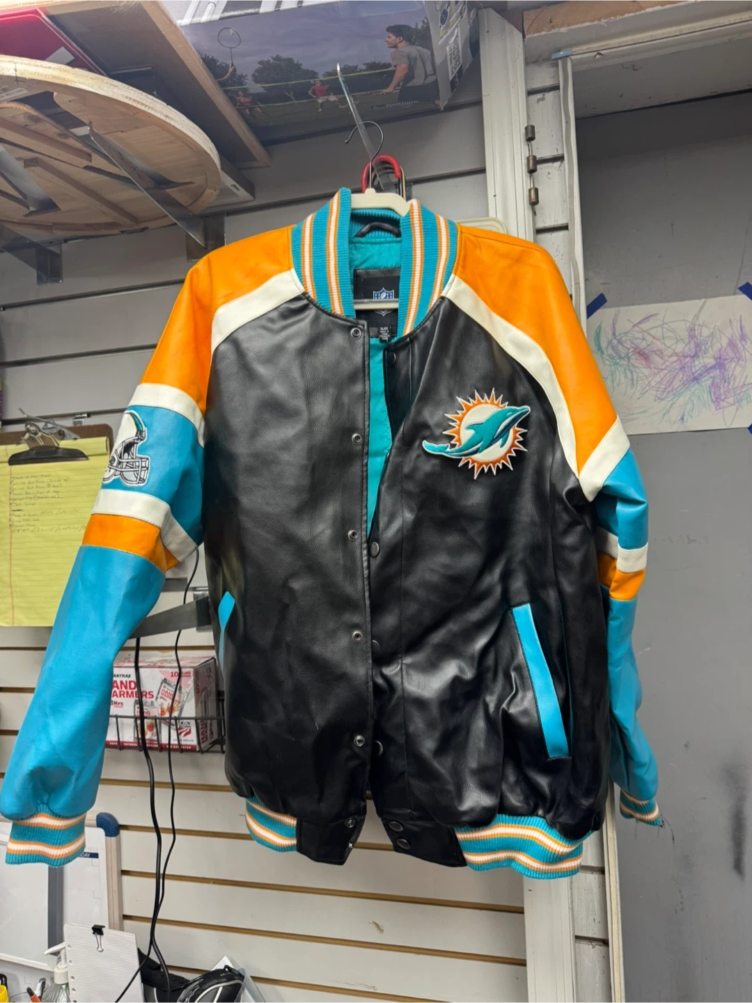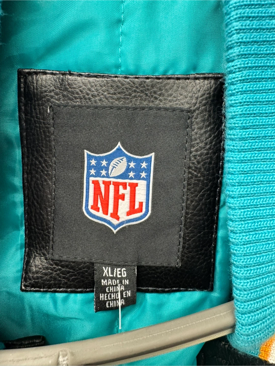 This is an official NFL Miami Dolphins letterman jacket. It's a size XL. Features team logo and colors on the front and back. Made from leather and fabric materials.