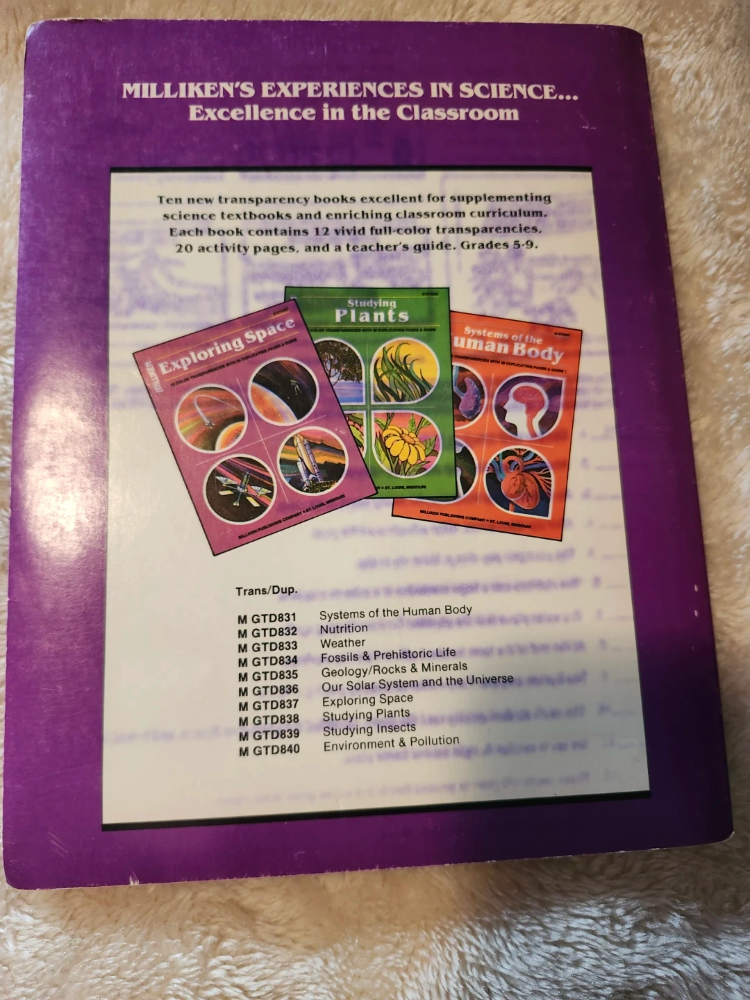 This vintage Milliken book, "Studying Insects", contains 12 vivid color transparencies, 20 duplicating pages, and a teacher's guide. It's suitable for grades 5-9. Copyrighted 1986. All pages and transparencies are like new!! A fantastic collectors item!