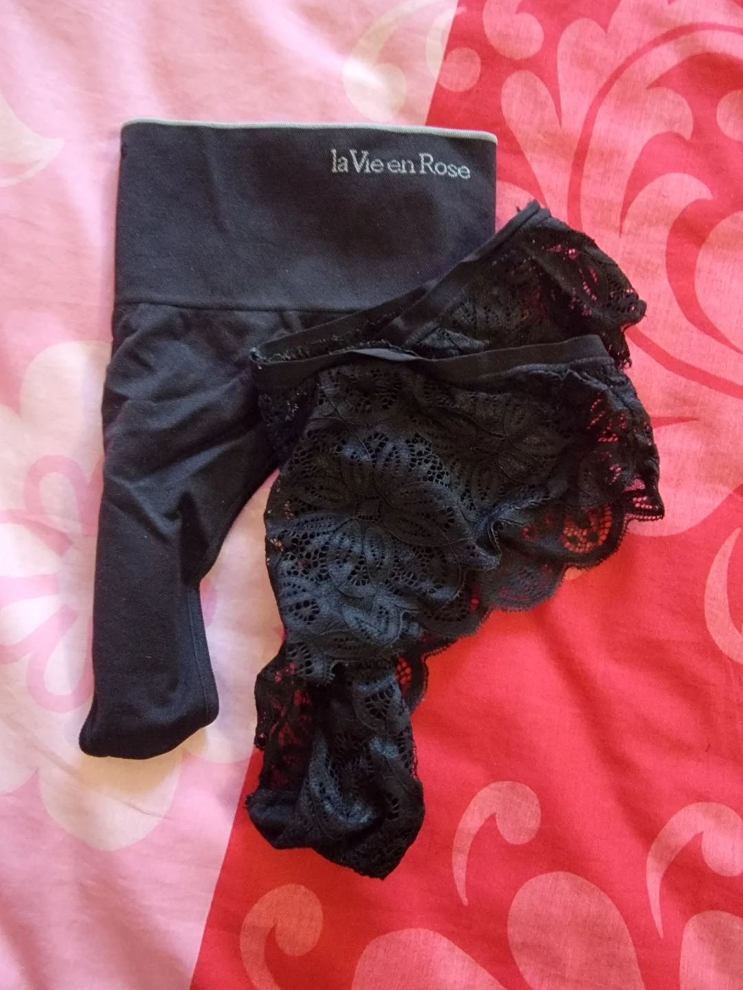 La Vie en Rose lingerie set with a black lace bralette and matching thong. It's made of soft fabric with intricate lace details.