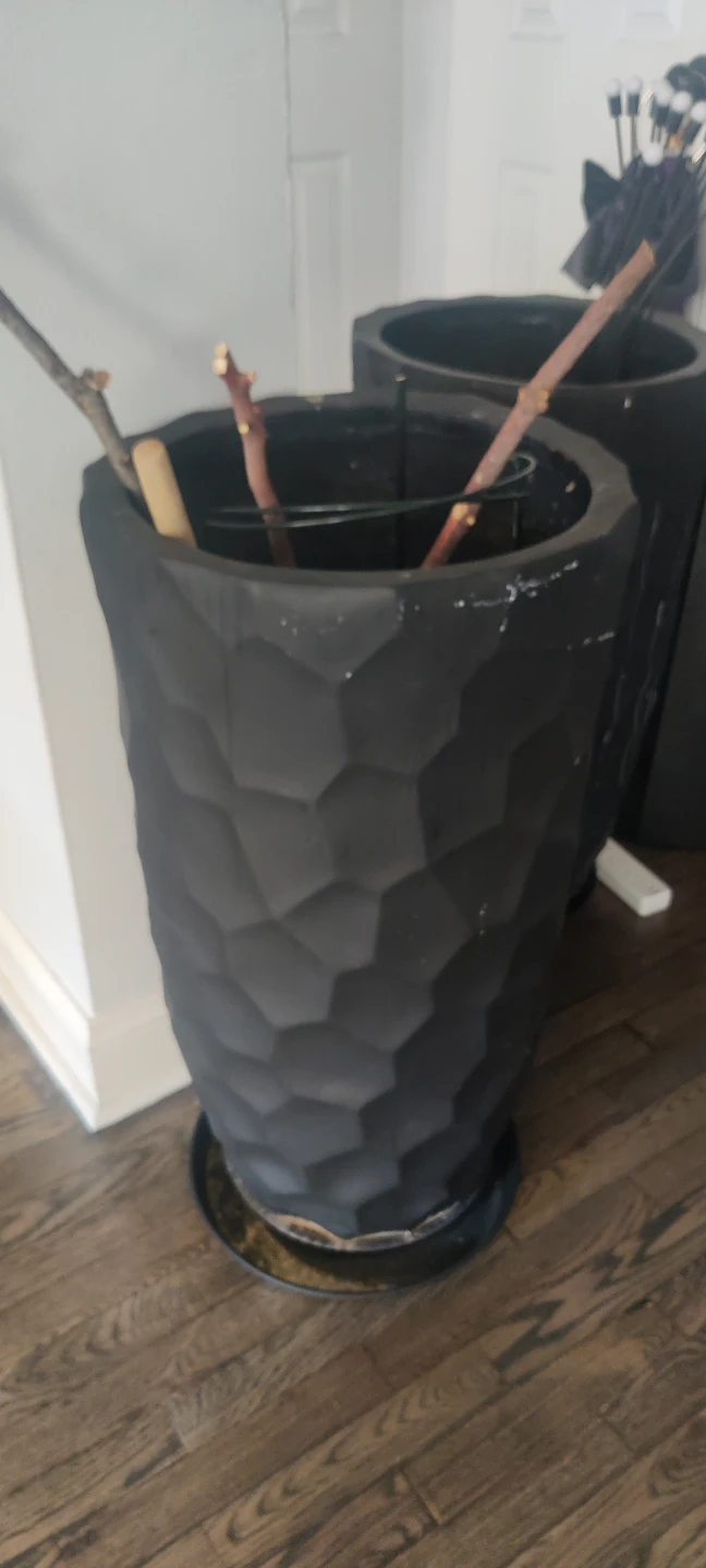 Selling a textured black planter. It has a unique design and would look great indoors or outdoors. There are some signs of wear, as shown in the pictures.