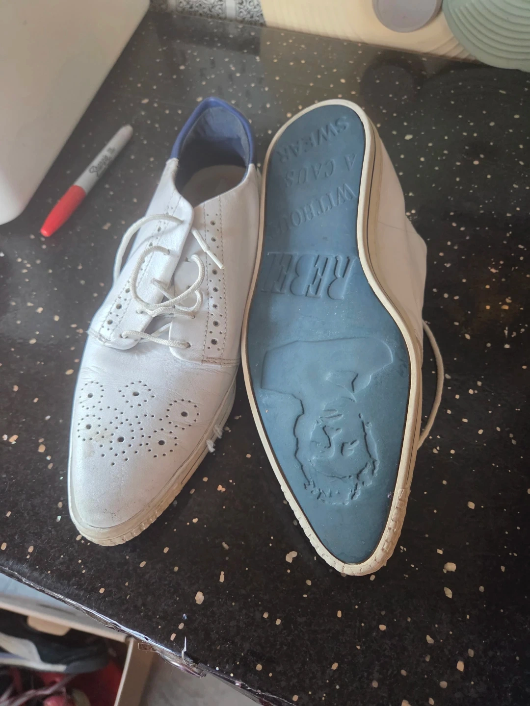These stylish white leather shoes feature a classic wingtip design with decorative perforations and a blue interior. The soles have 'Rebel Without A Cause' embossed on them. They're a cool addition to any wardrobe!