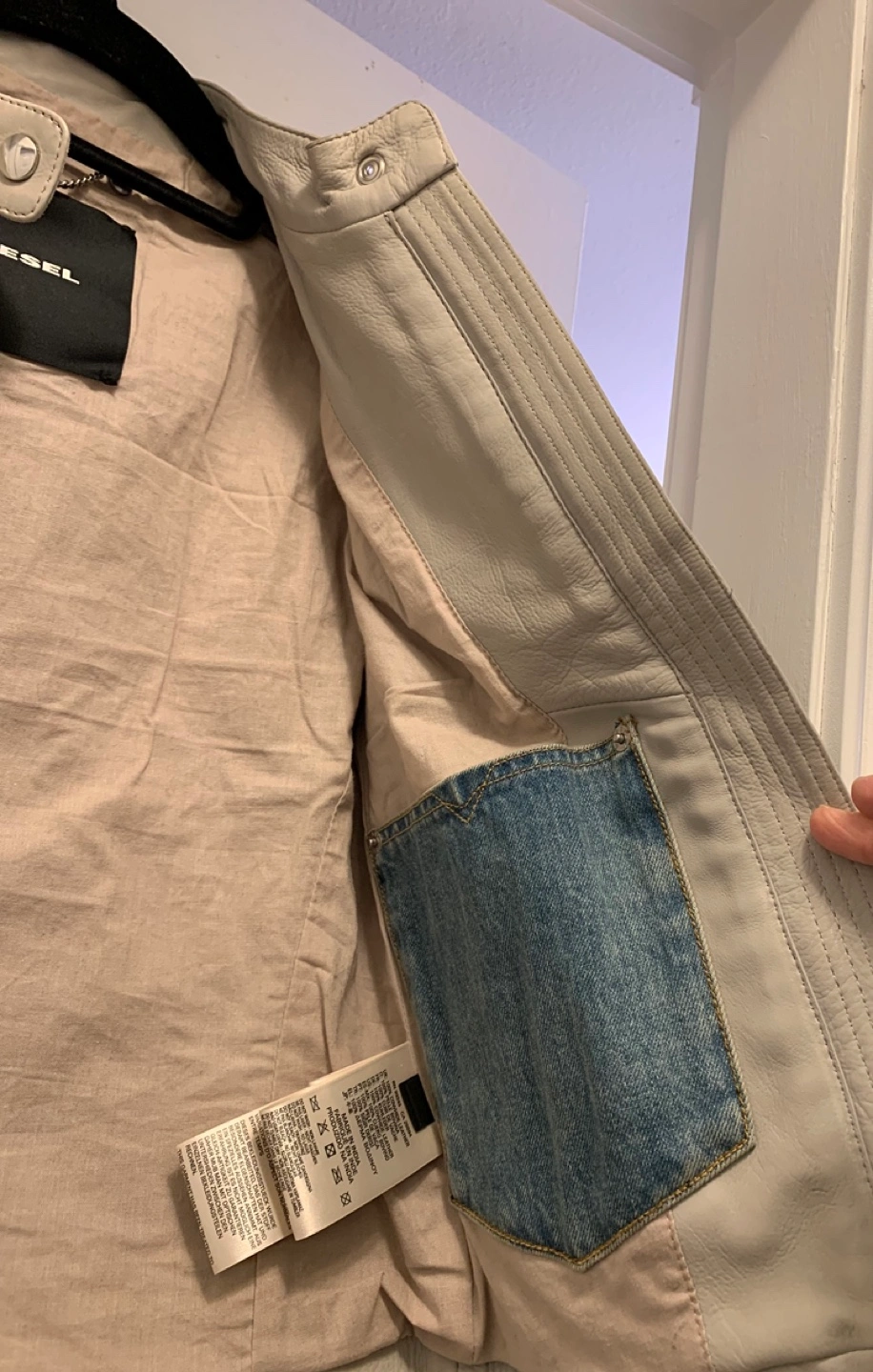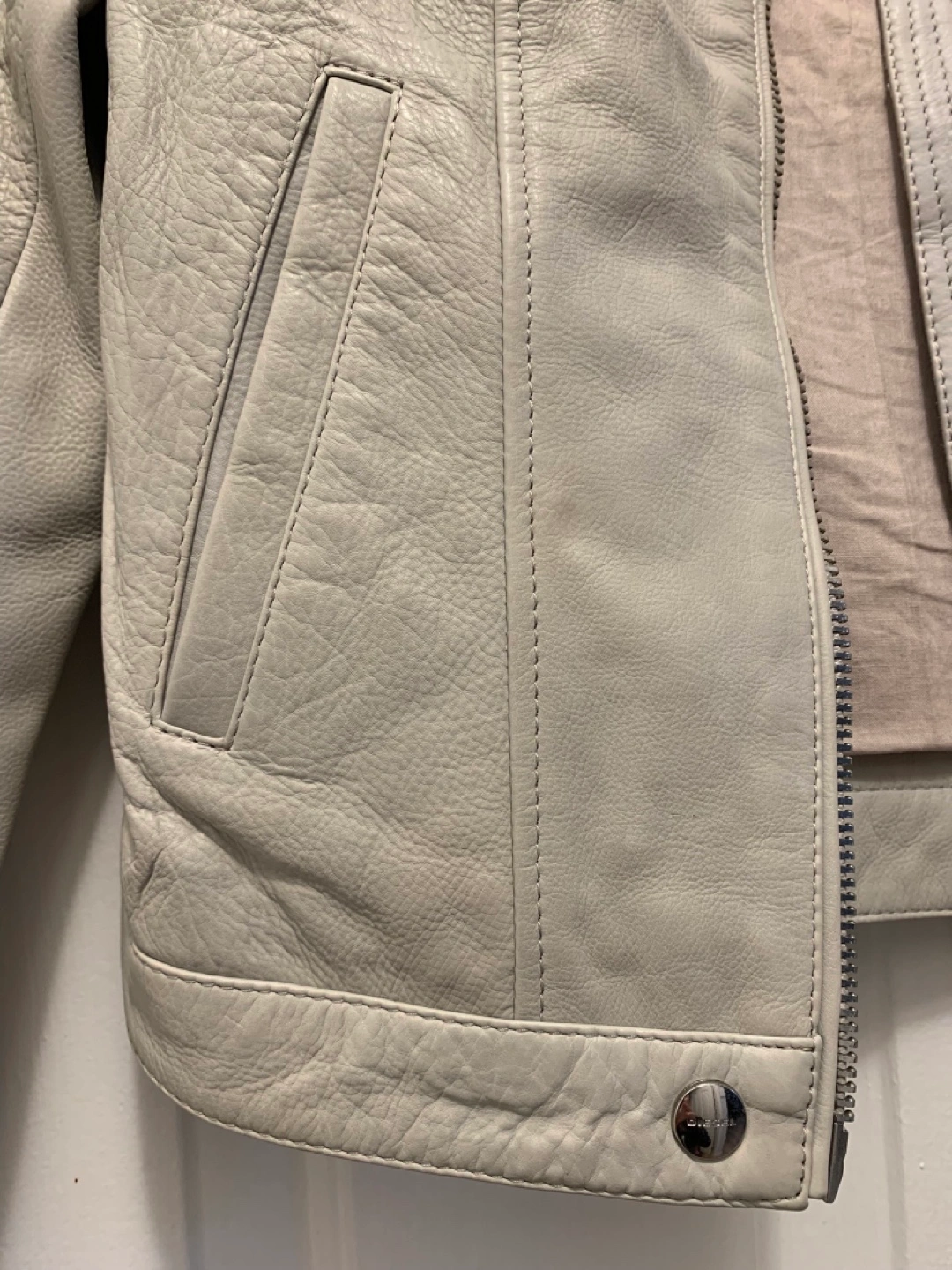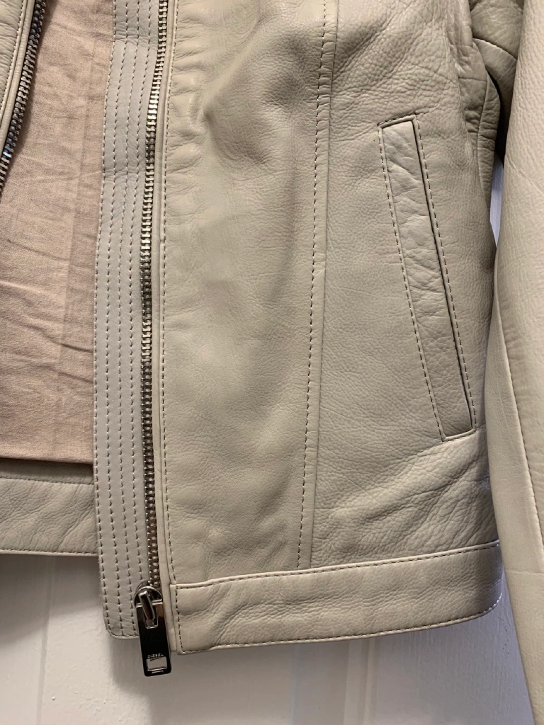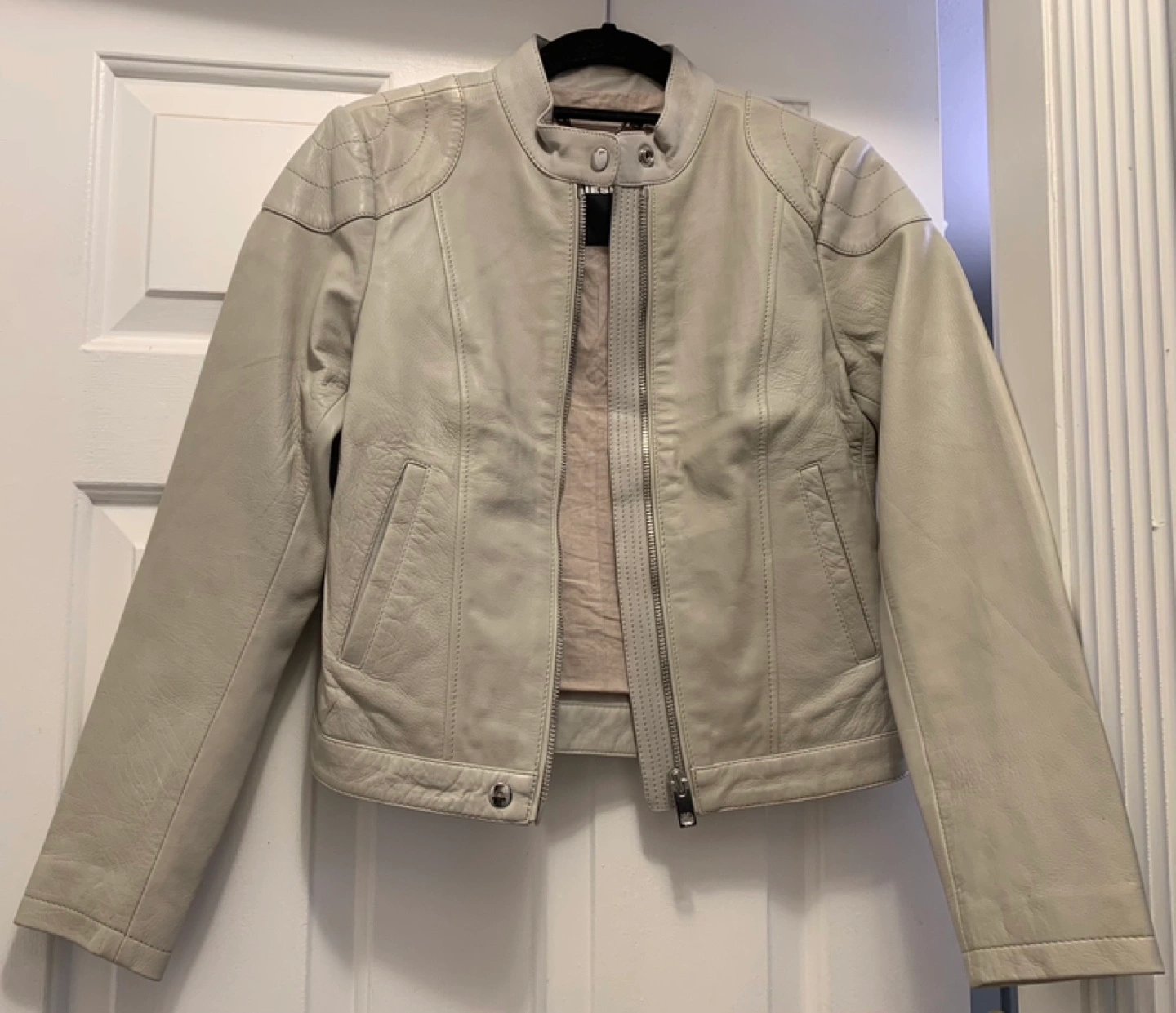Women's Diesel light grey leather moto jacket. Size small. Only worn couple of times, in perfect condition. Full zip closure. Shoulder detailing. Two front pockets. One inside pocket.
