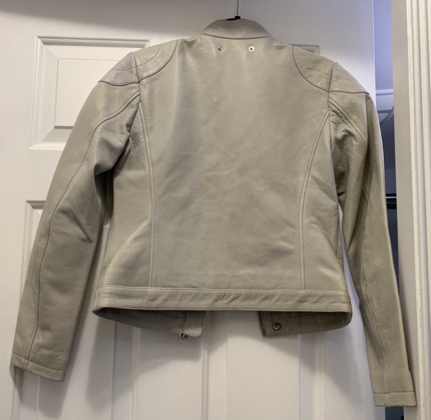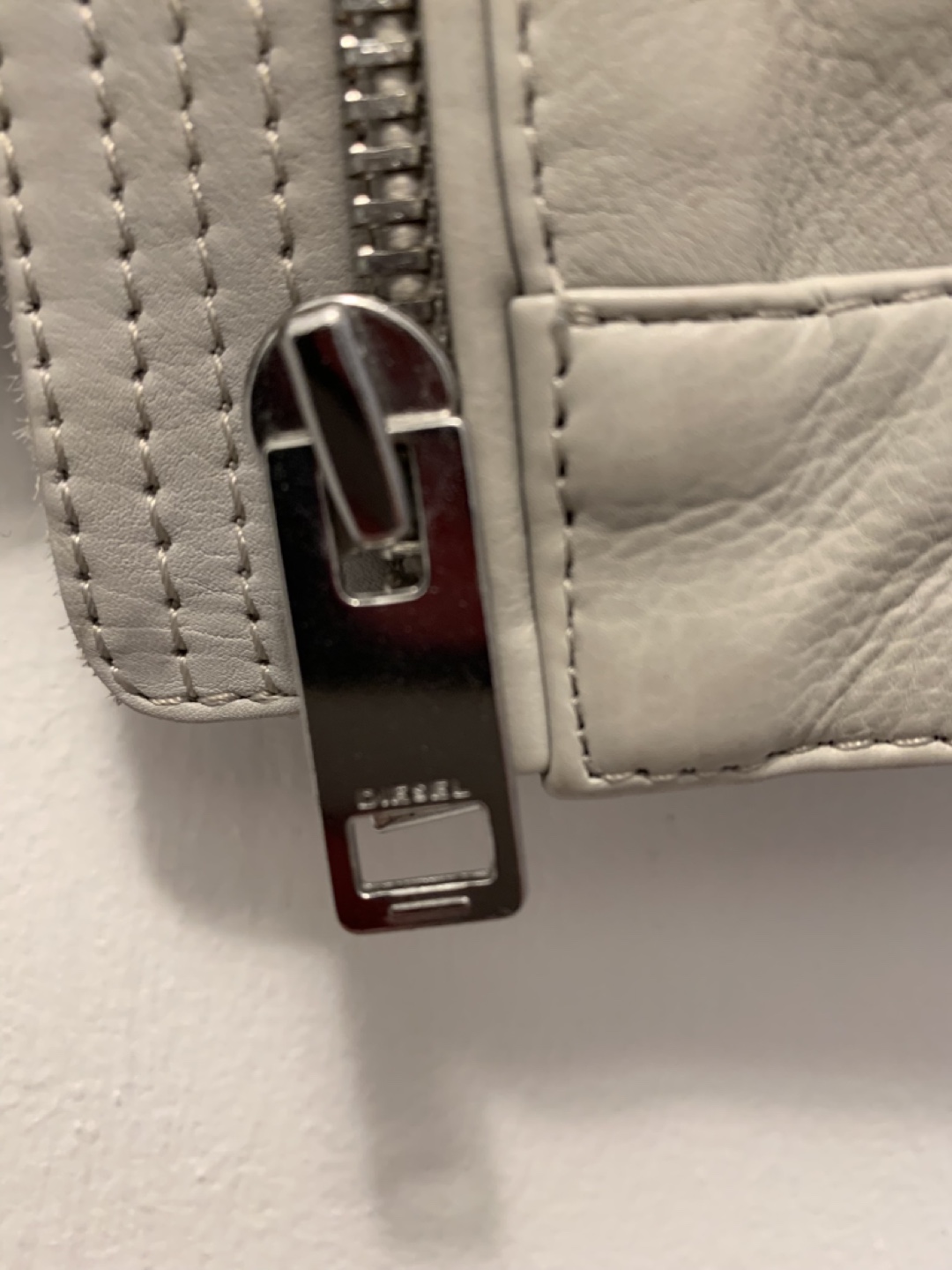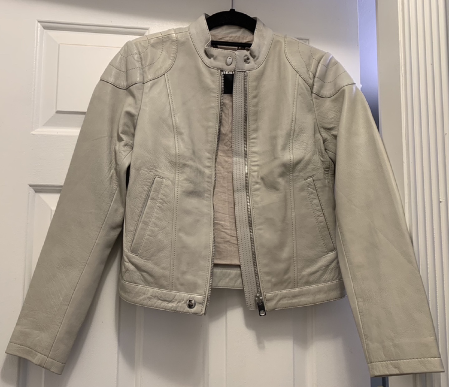 Women's Diesel light grey leather moto jacket. Size small. Only worn couple of times, in perfect condition. Full zip closure. Shoulder detailing. Two front pockets. One inside pocket.