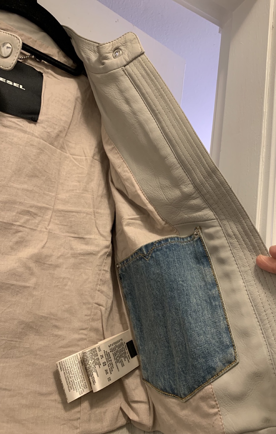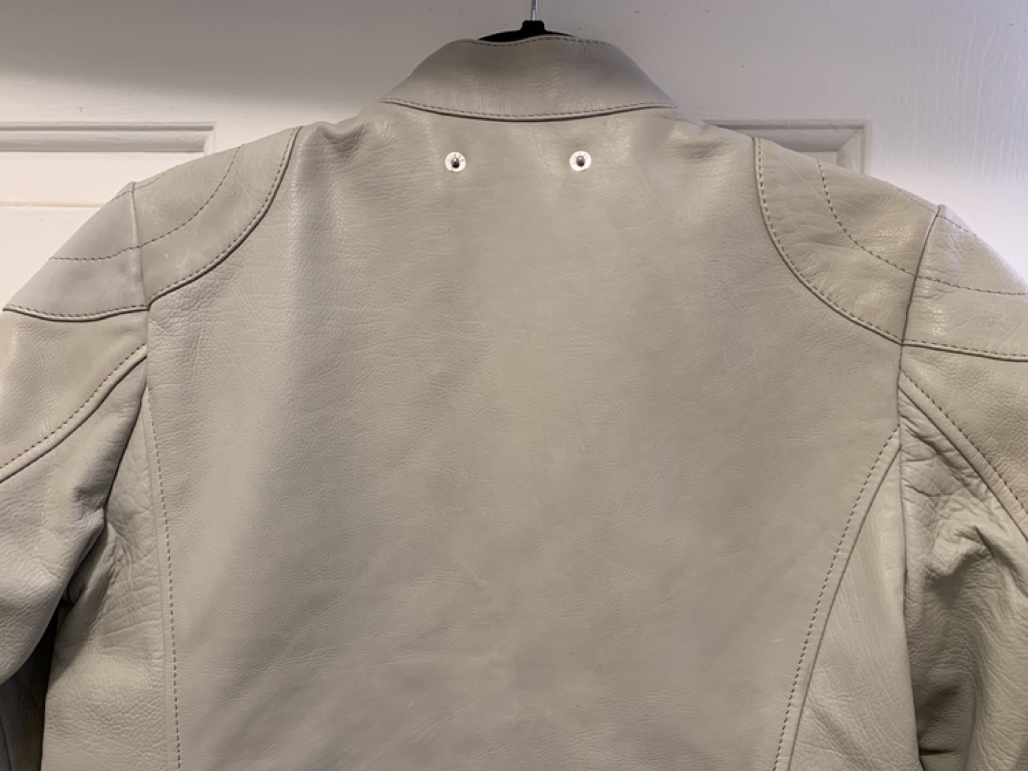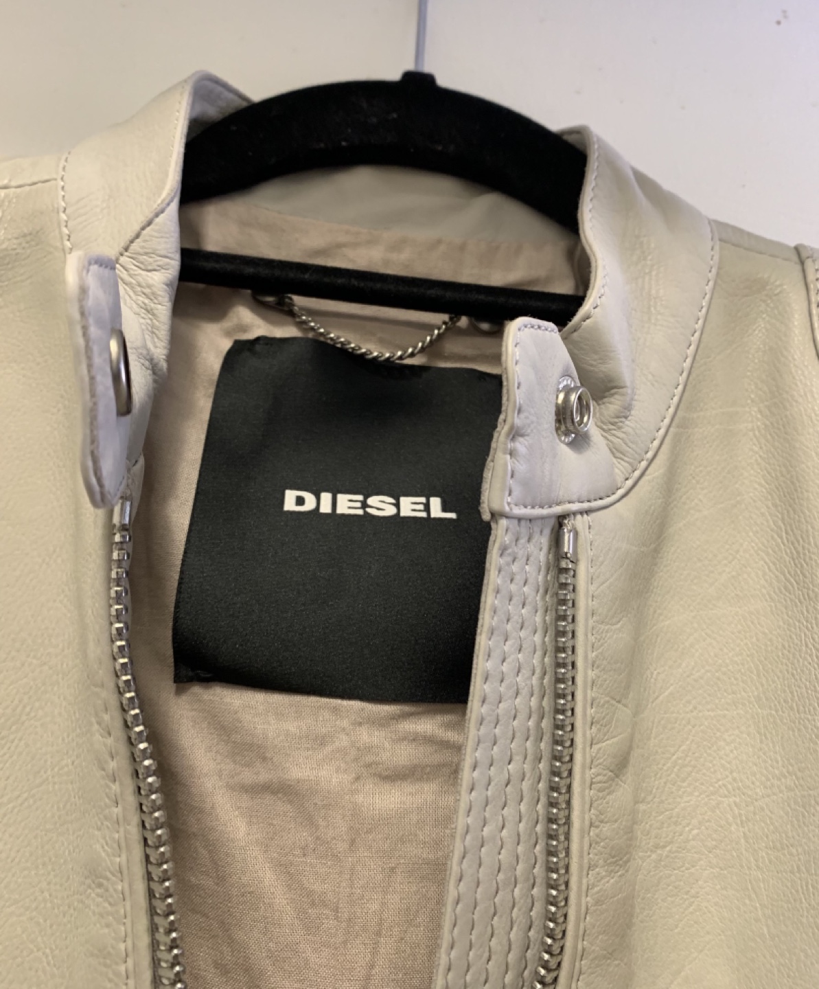 Women's Diesel light grey leather moto jacket. Size small. Only worn couple of times, in perfect condition. Full zip closure. Shoulder detailing. Two front pockets. One inside pocket.