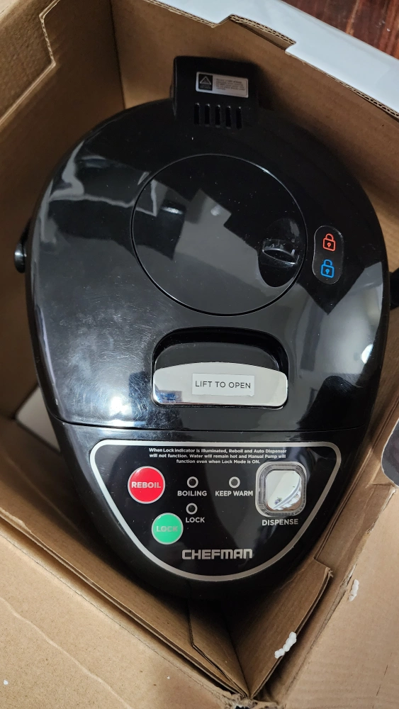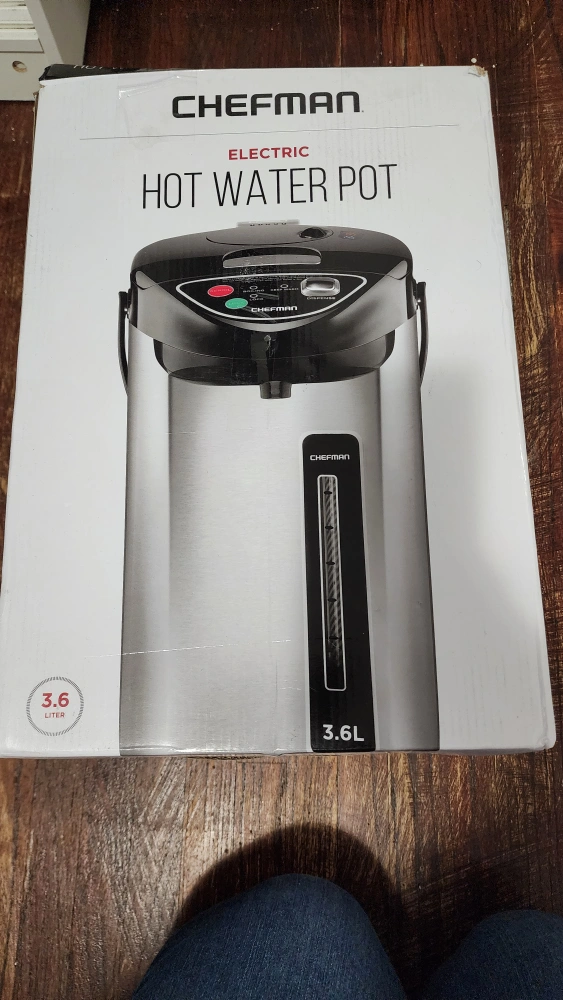 A hot water pot. Displays a silver cylindrical body. Black lid. Marked with button controls. Comes in its original box. Enjoying a cup of tea with this item would be lovely.