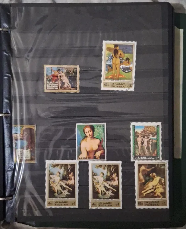 Collection of art stamps featuring classical paintings. Includes stamps from Fujaira, Manama, Paraguay, and Ajman. Dated series.