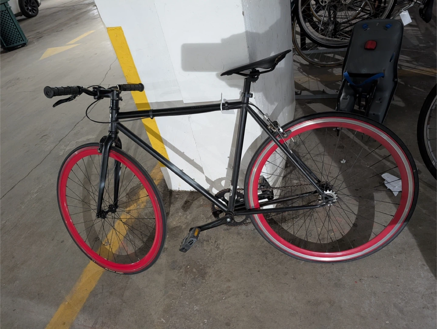 Black bike with eye-catching red rims. It features a durable black frame and standard handlebars. As is. Needs tuning and possibly inner tube or tire replacement.