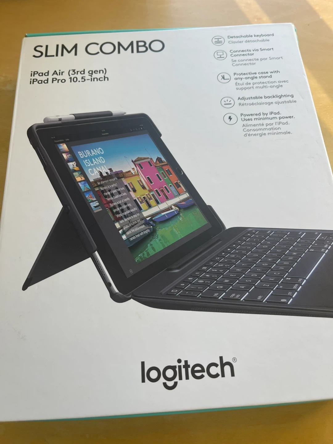 Selling a Logitech Slim Combo keyboard case for the iPad Air (3rd generation) IPad 9 and iPad Pro 10.5-inch. It features a detachable keyboard and connects via Smart Connector. The case also has a protective stand with any-angle support and adjustable backlighting. Comes with the original box!