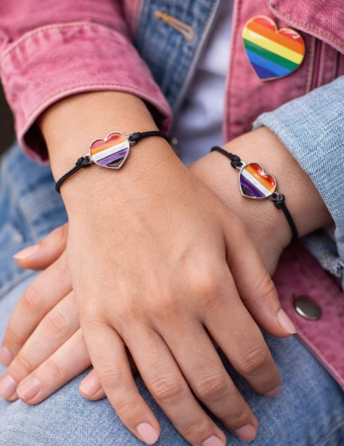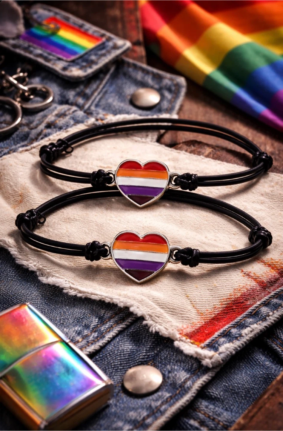 Two matching bracelets featuring heart-shaped charms with pride flag colours. The black cord adjusts with a sliding knot. These bracelets are perfect for showing your pride or supporting the Lesbians community!