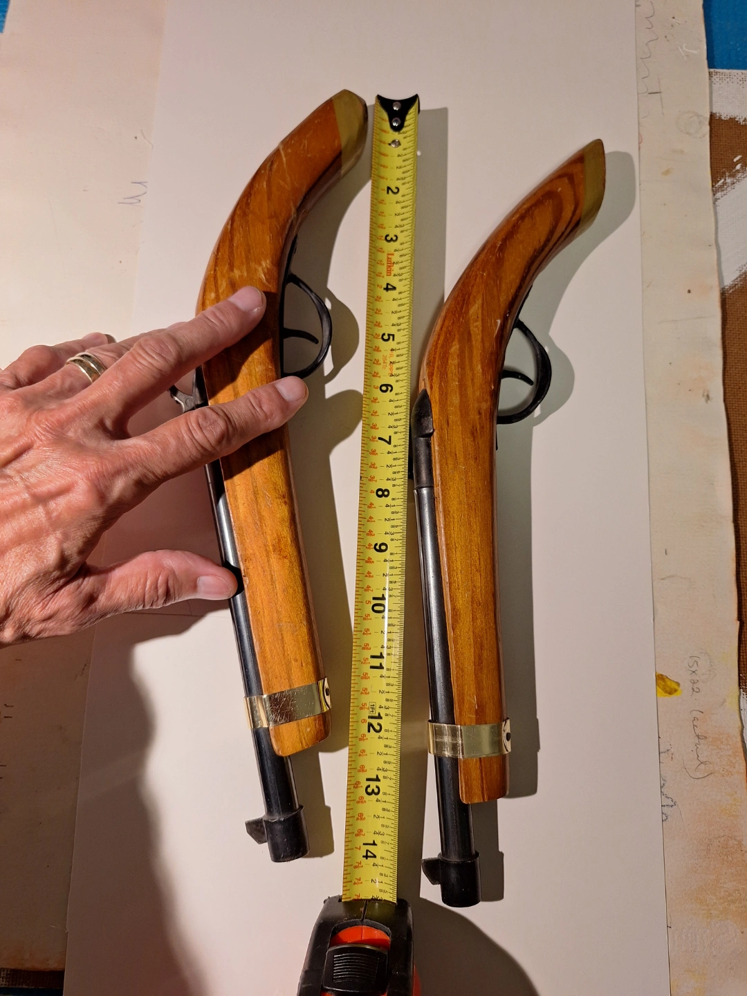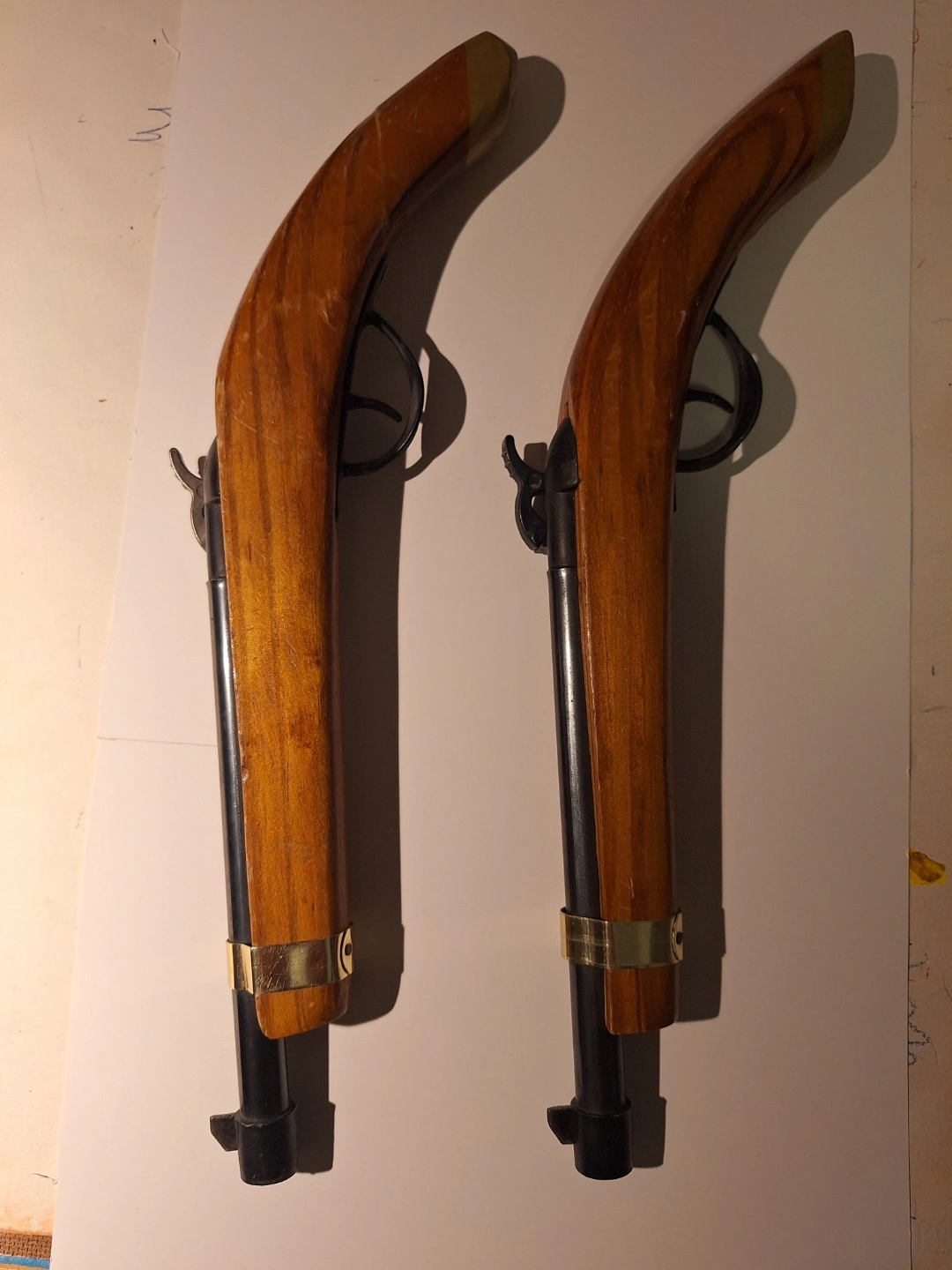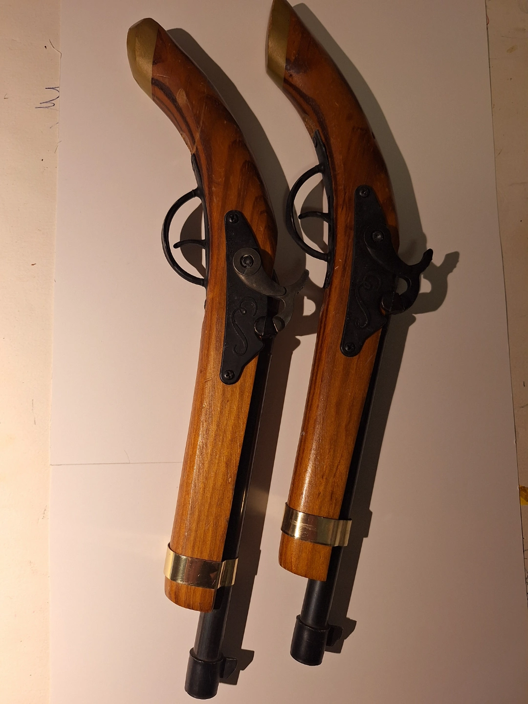 Two decorative toy pistols. Wooden grips, metal accents. Approximately 14 inches long. Collectible or display items.*can use single cap stickies* From Disneyland 40 yrs +*