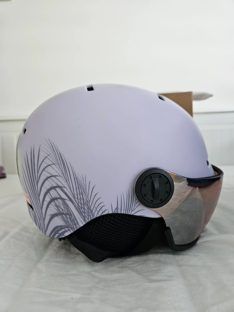 The helmet features a stylish palm leaf design on a light purple shell. Perfect for hitting the slopes!