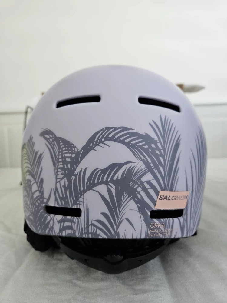 The helmet features a stylish palm leaf design on a light purple shell. Perfect for hitting the slopes!