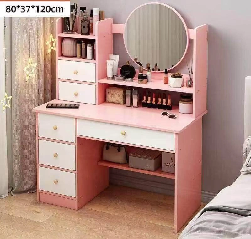 Adorable pink vanity set. Features a large mirror, multiple drawers and shelves for storage. Perfect for a bedroom or dressing area. Measurements: 80*37*120cm
