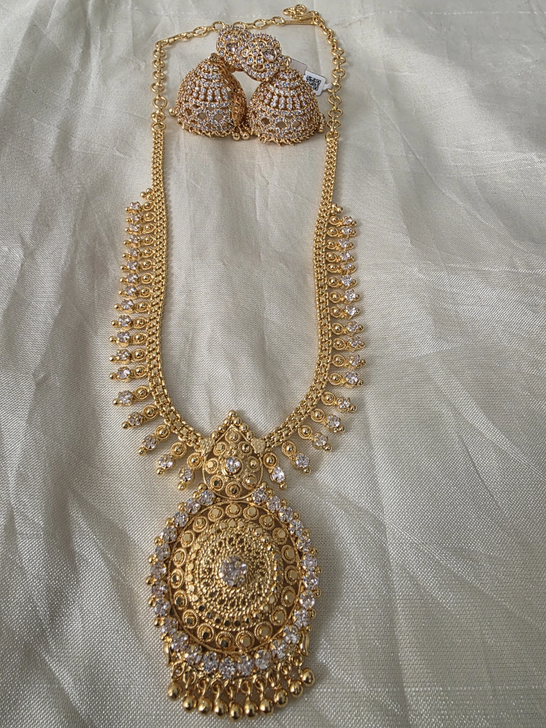 This set includes a gold-tone necklace and matching jhumka-style earrings. They are embellished with clear stones. Perfect for adding a touch of elegance to any outfit!