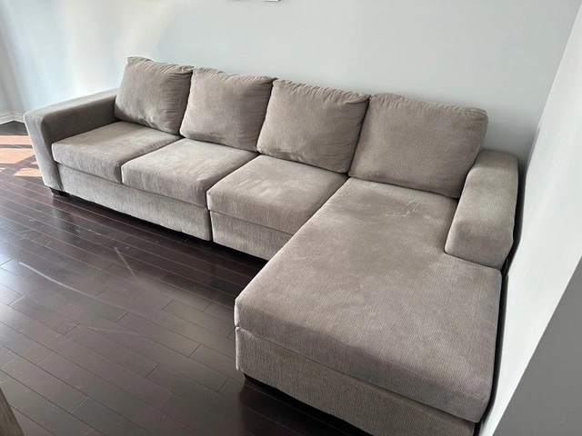 Dimensions: width 292cm / left side length 95cm / right side length 165cm / height 93cm. The L-shape can switch sides. In very good condition, used carefully, no stains, very clean.