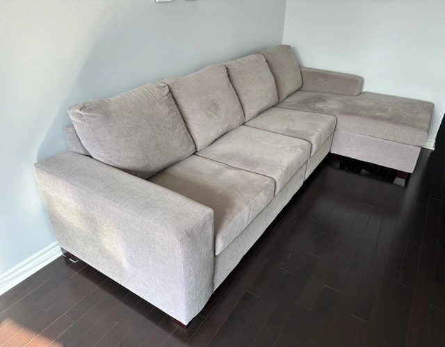Dimensions: width 292cm / left side length 95cm / right side length 165cm / height 93cm. The L-shape can switch sides. In very good condition, used carefully, no stains, very clean.
