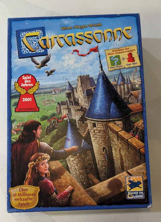 Carcassonne board game. Contains the base game and the expansion pack. Ages 7+ for 2-5 people. Bought in Germany hence German text on the box but instructions are available in English as well. The box has some wear from storage and moving but the board and game pieces inside are all included and in like new condition
