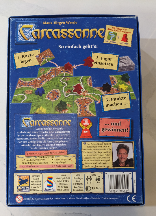 Carcassonne board game. Contains the base game and the expansion pack. Ages 7+ for 2-5 people. Bought in Germany hence German text on the box but instructions are available in English as well. The box has some wear from storage and moving but the board and game pieces inside are all included and in like new condition