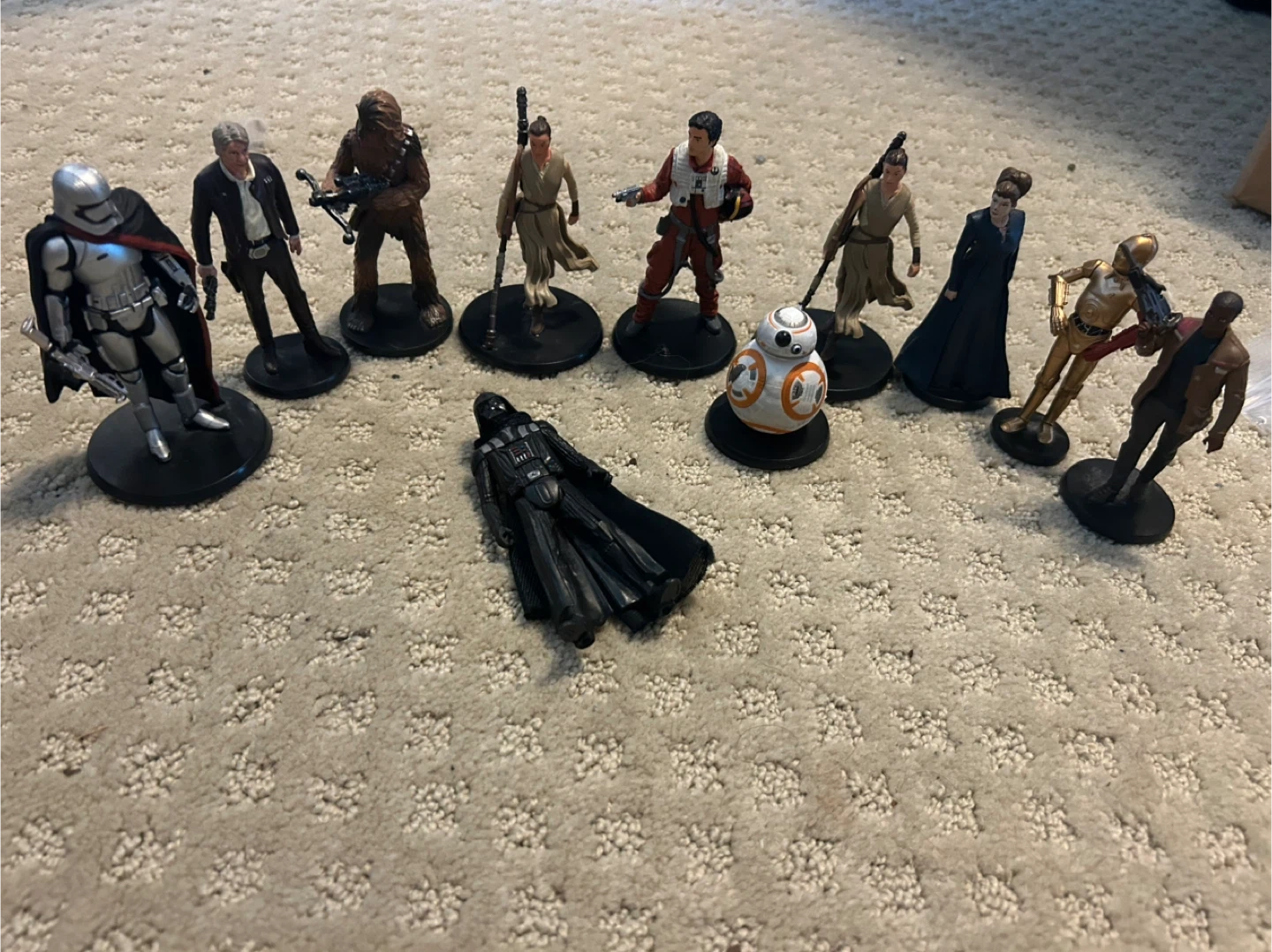 A collection of Star Wars action figures featuring characters like Darth Vader, BB-8, Han Solo, Chewbacca, Rey, Finn, and Captain Phasma. These figures are ideal for display or play. They're made of plastic.
