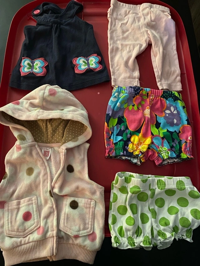 This is a Carters girls clothing bundle in size 3 months. This adorable set includes a shirt, leggings, a hooded vest and two pairs of shorts, all in good condition. These items have been gently worn and are ready for a new home. Brand: Carters, Size: 3 Months. Includes: shirt, leggings, hooded vest, 2 pairs of shorts. If the ad is still up, these cute clothes are still available! As is, no refunds.