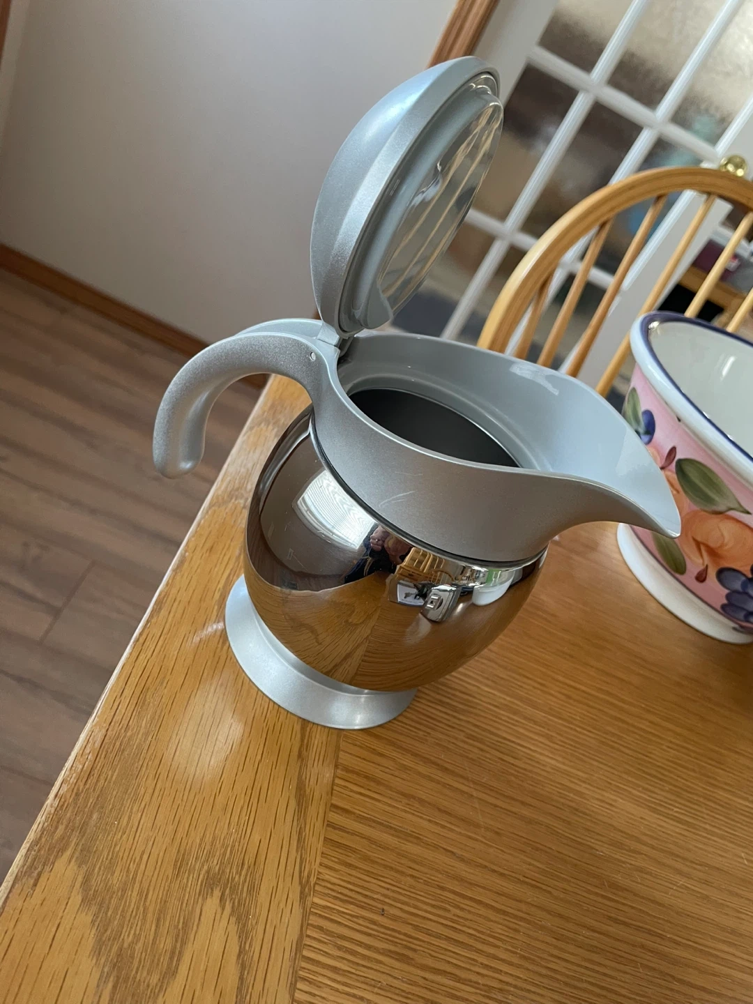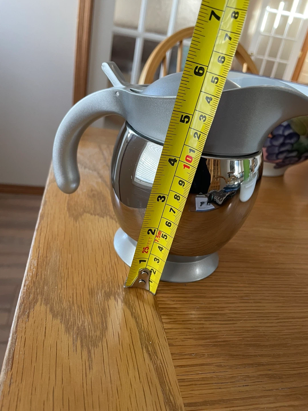 This silver and grey pitcher has a shiny chrome-like finish on the base and a matte silver top and handle. The lid opens and closes. It measures approximately 7 inches tall.