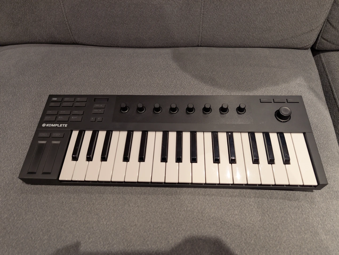 This is a Native Instruments Komplete Kontrol m32 MIDI keyboard. It features 32 velocity-sensitive keys, eight assignable knobs, and transport controls. It's great for music production and performance.