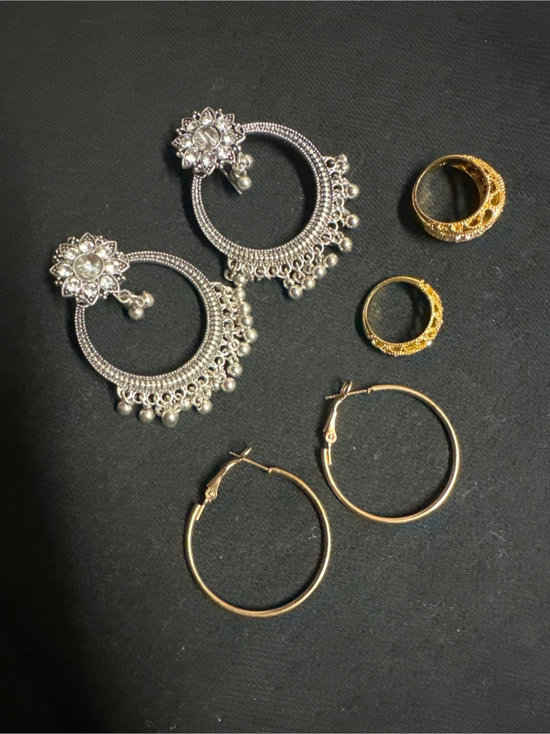 This set includes a pair of silver jhumka-style earrings adorned with faux diamonds and small bells. Also included are two gold-tone rings with intricate cut-out designs and a pair of simple gold-tone hoop earrings. The earrings are made from metal with silver and gold finishes, while the rings appear to be metal as well.